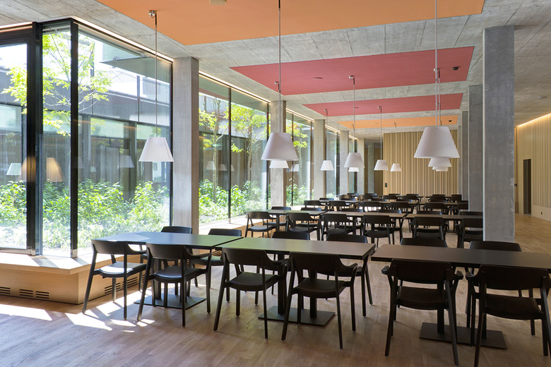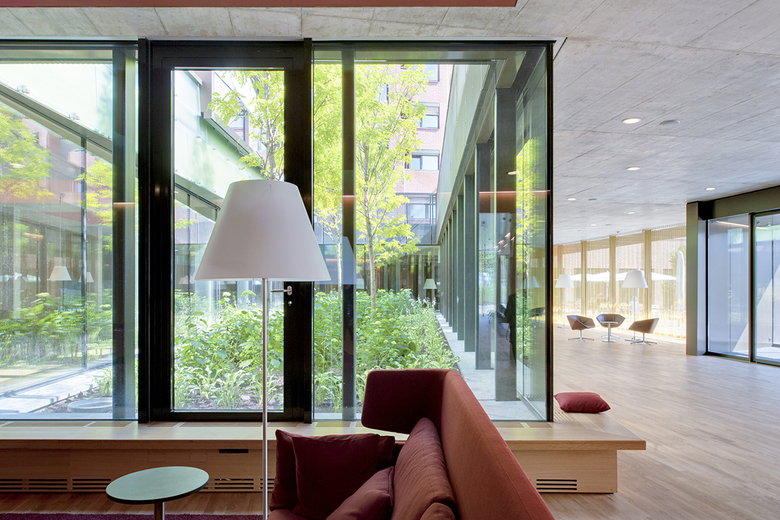 Der zentrale Innenhof bildet das Herz des gemeinschaftlichen Erdgeschosses. Er verbindet Altbau und Neubau, gewährleistet optimalen Lichteinfall, vermittelt die Atmosphäre auch innerhalb des  Hauses „im Grünen“, „im Garten“ zu sein und gliedert gleichzeitig die öffentliche Fläche in gut proportionierte Zonen unterschiedlicher Nutzung, die je nach Bedarf zusammengeschlossen werden können. Durch die interessanten Blickbeziehungen, den inszenierten Lichteinfall aus allen Himmelsrichtungen und die vielfältigen Wegbeziehungen in das Quartier hinaus, wird das Erdgeschoss zum qualitätvollen Gartengeschoss.