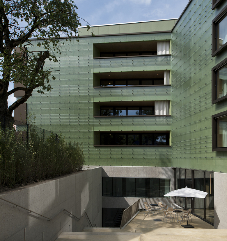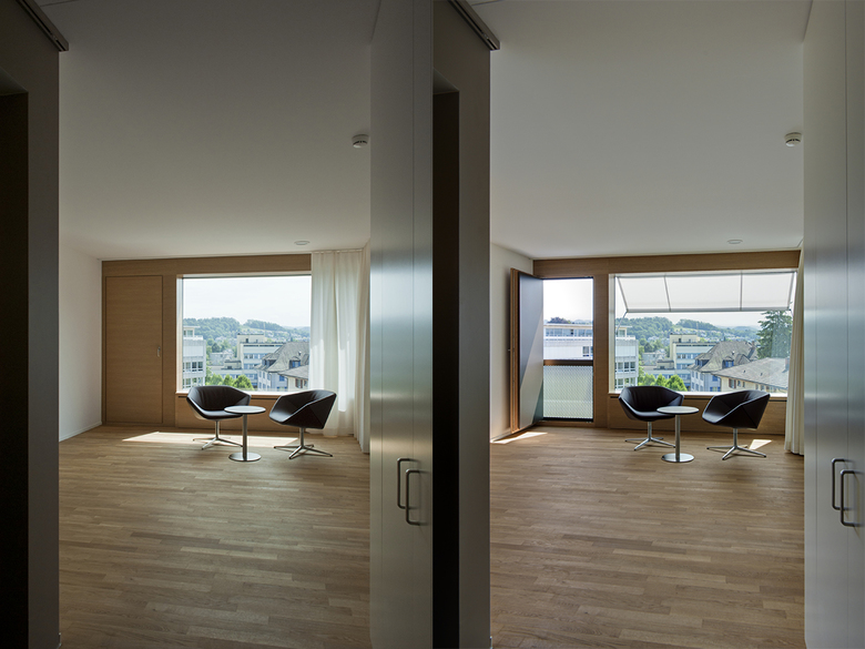 Die Erweiterung des Altersheims auf 155 Bewohnerinnen ist mit der freien Anordnung der Volumen im Park, dem architektonischen Ausdruck der Wohngeschosse sowie dem offenen, lichtdurchfluteten Erdgeschoss ein Beitrag zum Wohnen im Alter:
