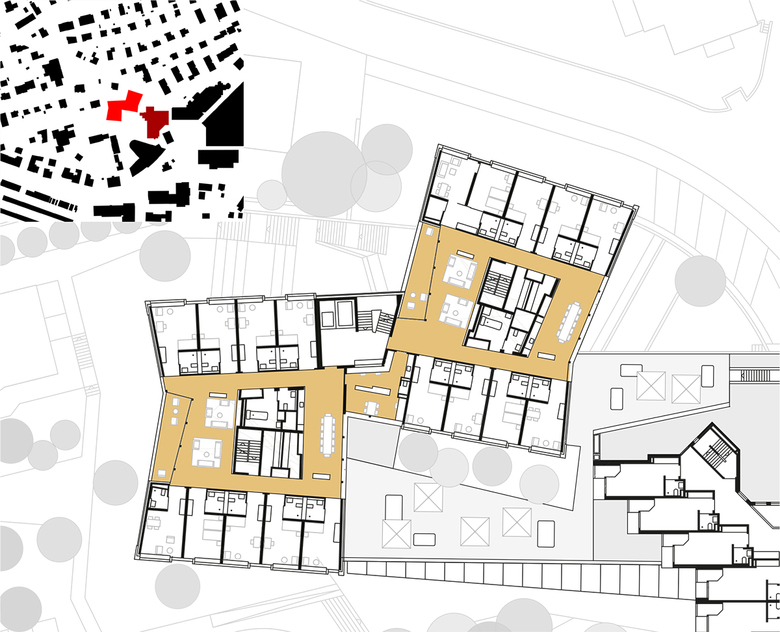 Der Neubau betont den Aspekt des Wohnens bei gleichzeitig optimaler Berücksichtigung aller Funktionen eines Alterszentrums. Die klare Ablesbarkeit der Wohngruppen am gemeinsamen Treppenhaus verstärkt den vertrauten Wohnungscharakter mit Individualräumen, Küche, Essplatz und Wohnzimmer. Die Einsehbarkeit der Wohnungen vom Stationszimmer ermöglicht Aufsicht und vermittelt Sicherheitsgefühl. Durch die prägnante Geschossstruktur mit den Wohneinheiten nach Westen und Osten und dem von Norden nach Süden durchgesteckten Gemeinschaftsbereich, der durch den Nebenraumkörper in Ess- und Arbeitsraum und Wohnbereich gegliedert wird, werden Korridore vollständig vermieden und differenzierte Lebensbereiche geschaffen.