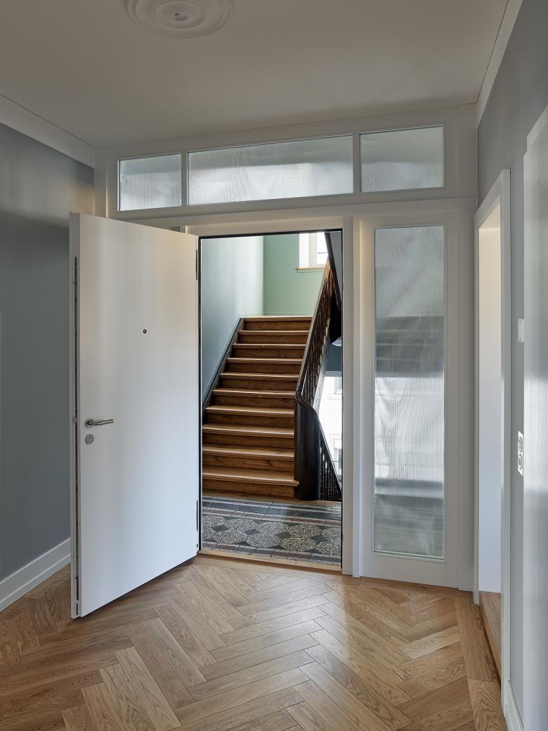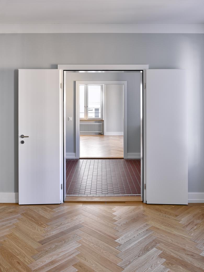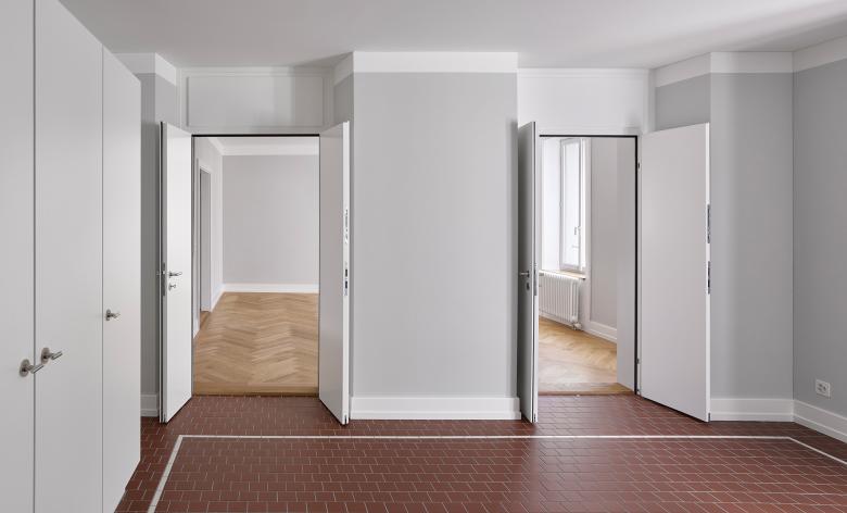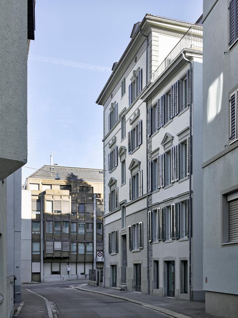 Der sparsame Innenausbau mit sorgfältiger Detailierung, Material- und Farbwahl unterstützt die Raumstruktur und lässt die verlorengegangene Qualität und Stimmung des baumeisterlichen Hauses, die in der Gestaltung der stattlichen und stolzen Fassaden noch vorhanden sind, wiederaufleben.
