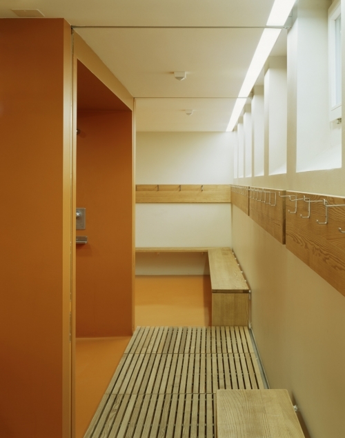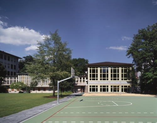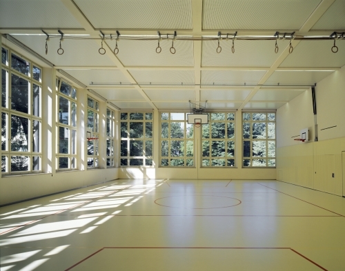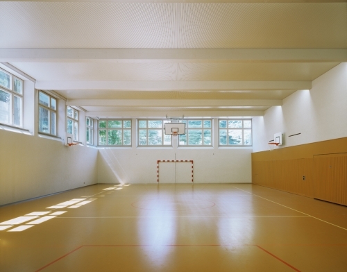 Aufbauend auf der vorangegangenen Sanierung des Klassentraktes unter denkmalpflegerischen Gesichtspunkten wird bei der Gesamtsanierung des Turnhallentraktes das Material- und Farbkonzept des Schulhauses differenziert weitergeführt, um die Grosszügigkeit und die Eleganz der Anlage zu unterstreichen.