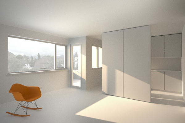 Die Gebäude weisen eine intelligente grosszügige Grundstruktur auf, die auch langfristig gut und flexibel nutzbar sein wird. Unsere Konzeption zeigt auf, wie unter Wahrung dieser bestehenden Raumstruktur mit präzisen Eingriffen die Wohnungen neu interpretiert und durch gezielte gestalterische Massnahmen gesamthaft aufgewertet werden können. Der Einbezug der strassenseitigen Balkone und Loggien in die Wohnfläche und das Entfernen der WC – und Speiseraumeinbauten vergrössert die Wohnungen und stärkt die wichtigen Querbezüge zwischen der städtischen Nordostseite mit Blick zum Zürichberg und der „grünen“ Südwestseite mit Weit- und Seesicht. Die räumliche und funktionale Qualität des „Durchwohnens“ prägt die Wohnungen und wertet sie entscheidend auf.