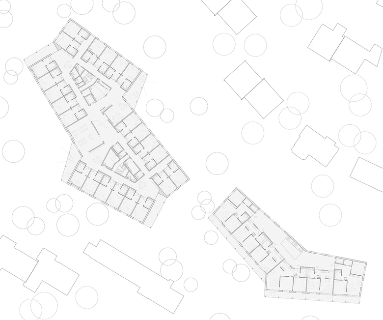 Die Wohngruppen sind kompakt organisiert und mit kürzesten Wegen für den Betrieb optimiert. Ein zentral gelegenes Wohngruppenbüro hat einen Überblick über die ganze Etage. Die Anzahl der Zimmer wird in zwei überschaubare klare Einheiten um eine gemeinschaftliche lichtdurchflutete Mitte organisiert. Wohlgestaltete Räume, belichtete Erschliessungsflächen erleichtern die Orientierung und tragen dem Wohnkomfort bei. Die gemeinschaftlichen Räume definieren die Atmosphäre der Wohngruppe. Im mittleren schmalsten Teil des Baukörpers entsteht eine Abfolge von gemeinschaftlichen Innen- und Aussenräumen. Der Essraum, Wohnraum und zwei Balkone bilden eine spannende Raumkette die von zwei Himmelsrichtungen profitiert und das Regelgeschoss schön gliedert.