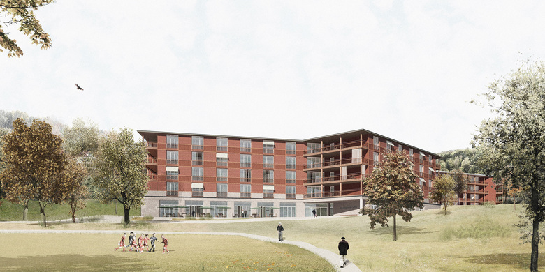In schönster Landschaft und Aussichtslage fügt sich das neue Pflegeheim Wier in den Grünraum oberhalb des Ortszentrums von Ebnat-Kappel ein. Selbstbewusst zeigt sich das Pflegeheim als öffentliches Gebäude über der Weite des Sportplatzes. Die exponierte Lage am Hang, die Nähe des Waldes und der Ausblicke in die Weite bieten eine einzigartige Atmosphäre, die den gesamten Aussenraum prägt. Durch die geschickte Platzierung der beiden Volumen entsteht ein neues Ensemble von Pflegeheim und Alterswohnen, das sich selbstverständlich in die Landschaft einfügt und spannende Aussenräume bietet.