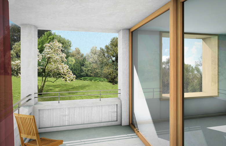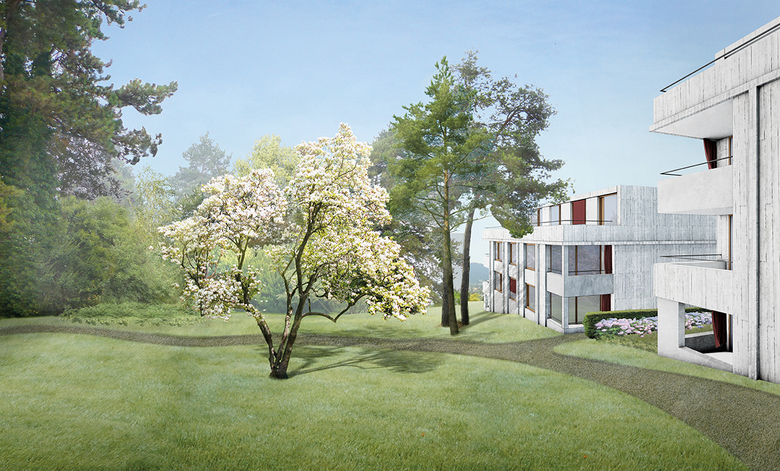 Innerhalb der klaren und rationellen Grundstruktur werden die Qualitäten des Grundstücks für jede Wohnung individuell optimal und massgeschneidert genutzt: die Aussicht auf Stadt und See, die privaten Sitzplätze und Gärten, das Wohnen am prächtigen alten Park. Die präzise gesetzten Fenster und Loggien der Wohnräume rahmen den Blick: der Park wird im Wechsel der Jahreszeiten wesentlicher Teil der Wohnung. Mitten in der Stadt. Die Materialisierung unterstützt die stimmungsvolle Lage im Garten: als zeitlose murale Bauten mit differenziert gestalteten Betonoberflächen bilden sie die ruhige und selbstverständliche Fassade am Park.