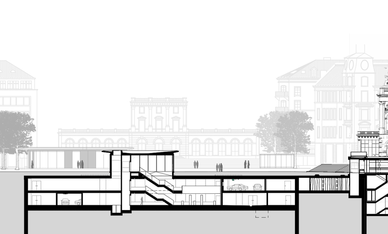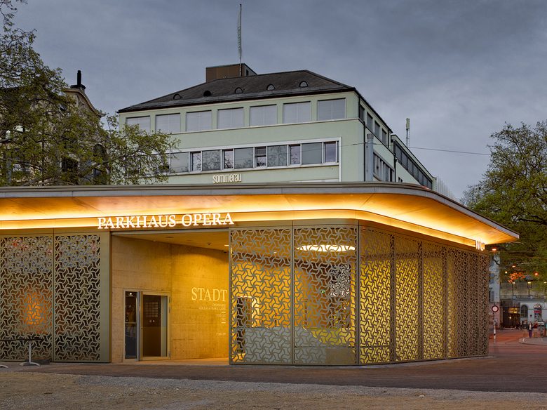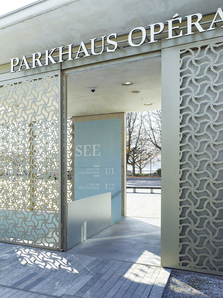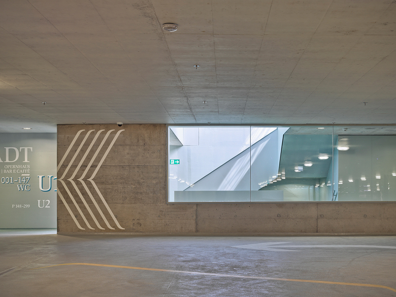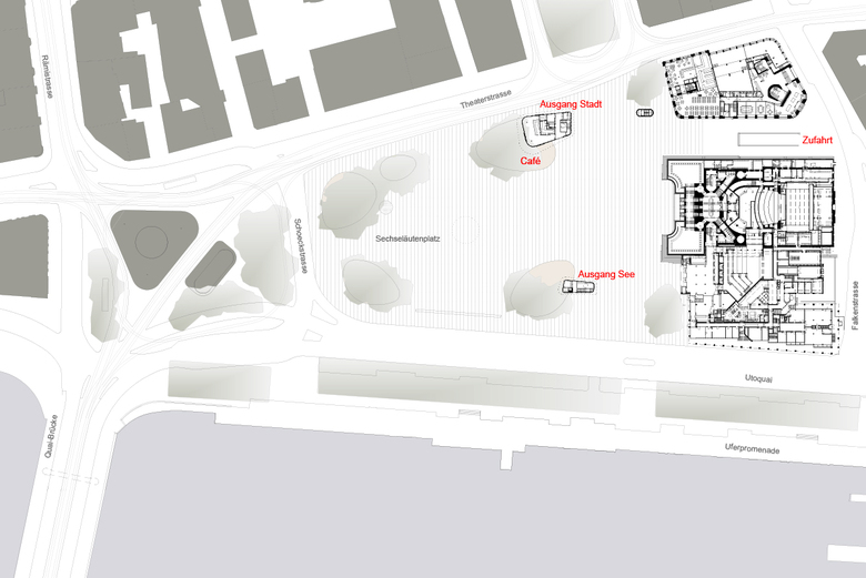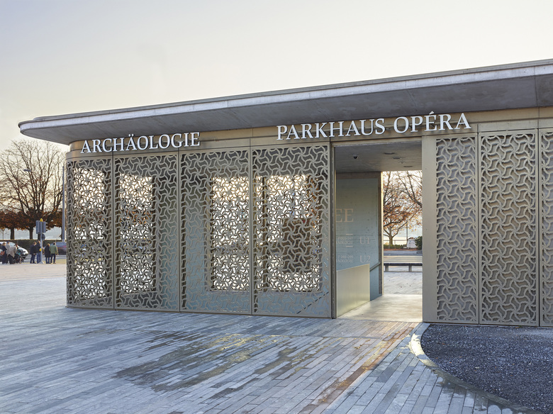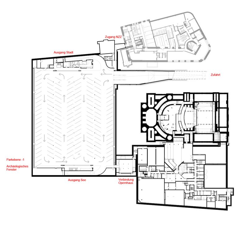 Das neue Parkhaus ist nach dem Verzicht auf die Realisierung des Wandelhalle des Wettbewerbsprojektes von der Oper abgerückt und spannt sich grosszügig zwischen den zwei Polen der Zugänge „Stadt“ – an der Theaterstrasse mit Café - und „See“ – am Utoquai mit der archäologischen Ausstellung - auf.