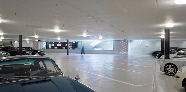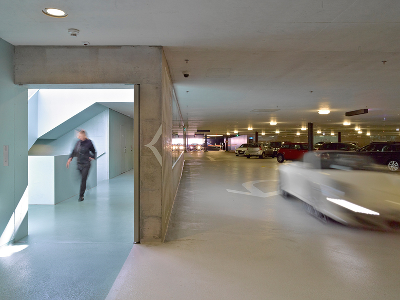 Die Rationalität der unterirdischen Parkierungsanlage wird mit gezielten gestalterischen Auszeichnungen aufgewertet: Die Zufahrt von der Falkenstrasse wird als festlicher Auftakt, als geheimnisvolles Eintauchen hinunter in die offenen und übersichtlichen Hallen inszeniert. Die mitternachtsblauen Schallschutzwände werden zum festlichen Vorhang.