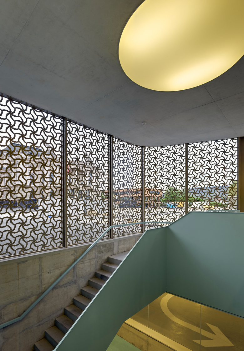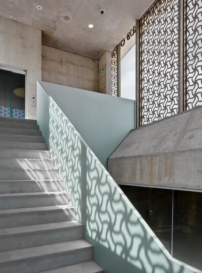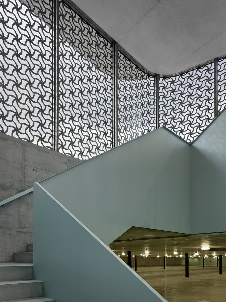 Das Ornament, das auf einem Entwurf der Textildesignerin Janine Graf basiert und auf dem stilisierten Grundmotiv des Zürichsees aufbaut, zeigt dabei atmosphärisches Licht- und Schattenspiel bis hinunter auf die Parkebenen. – verbindet Platz und Parkhaus. Sichtbares Zeichen des inneren Zusammenhangs der beiden Bauaufgaben.