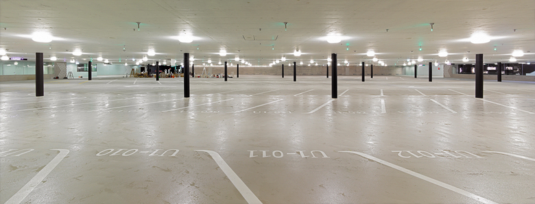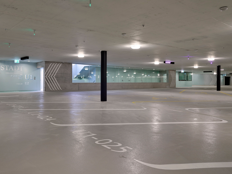 Auf zwei Parkebenen mit den Gesamtabmessungen 60m x 85m werden kompakt und übersichtlich 299 Parkplätze angeboten. Die mittige Stützenanordnung mit bis zu 13.75m Spannweite bietet ungehinderte Sicht, ermöglicht das einfache Ein- und Ausparken und bequemes Aussteigen. Keine Stütze steht im Weg.