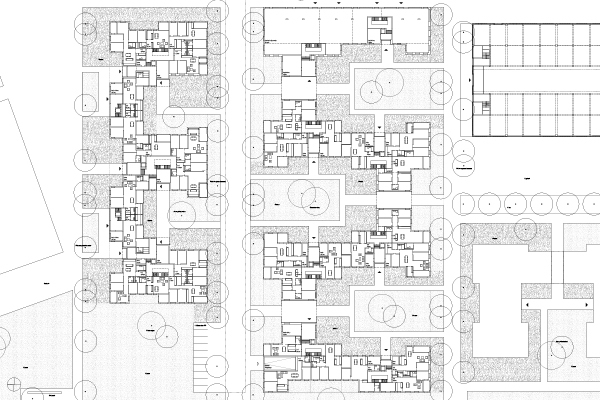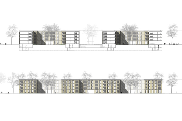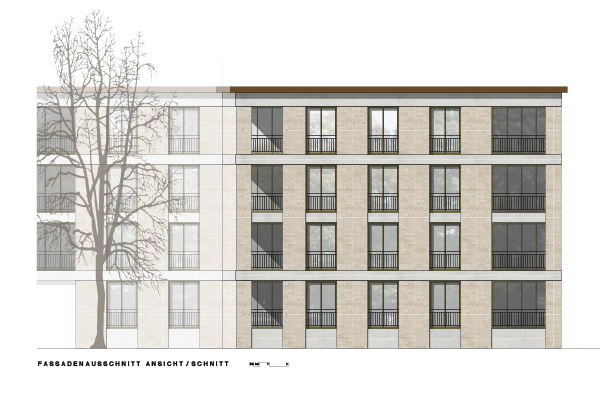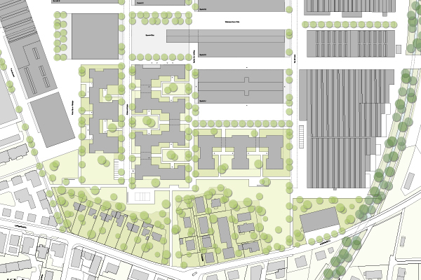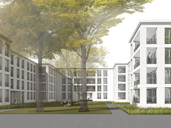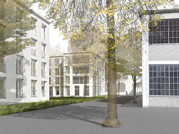 Die vorgeschlagenen Gebäude der Baufelder D, F und J sind viergeschossige Hofbauten. Mit ihren Gebäudefluchten und den immer gleichen Höhen bilden sie den Stadtkörper und die historischen Strassenräume nach, ihre Formate nehmen die Dimensionen der benachbarten Industriehallen auf. Die tiefen Höfe öffnen sich zur weitläufigen Grünanlage und lassen die Wohnungen daran teilhaben. - Wohnen im Park. Die Fassaden der Neubauten übernehmen Material und Farbigkeit der südlich angrenzenden, bestehenden Industriebauten und betonen so die städtebauliche Einheit.