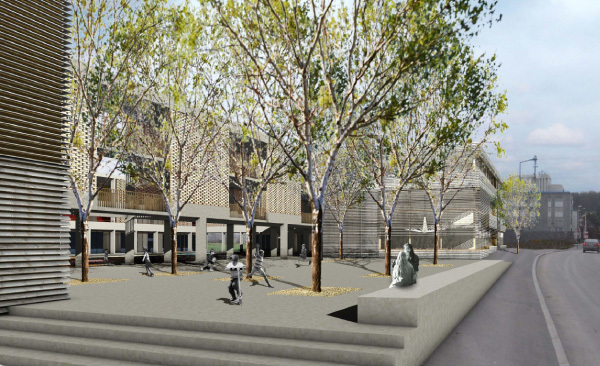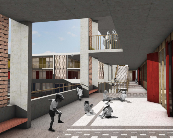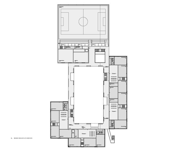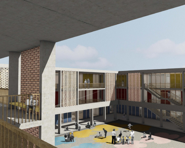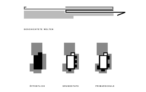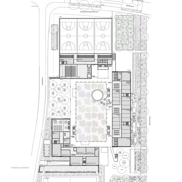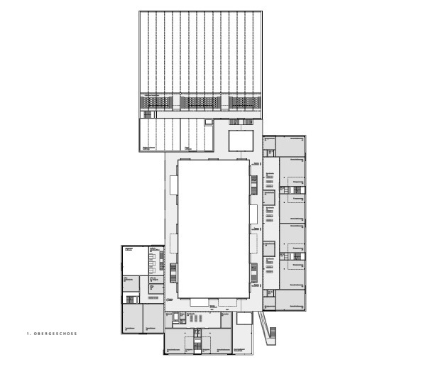 Das Zentrum der Schule und des Quartiers ist der grosse Hof. Grosszügige Lauben, offen erschlossen, lassen die beiden Obergeschosse wie Erdgeschosse erscheinen und machen die Anlage zur Pavillonschule auf Etagen. Das erste Obergeschoss ist die Welt der Grundschule. Jeweils zwei Spiel- / Klassenräume bilden zusammen ein „Haus“ und damit eine überschaubare, familiäre Einheit. Öffenbare Fassadenfronten schaffen eine intensive Beziehung zum Aussenraum der Lauben.