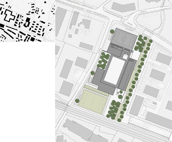 Mittendrin – Dem neuen Wohngebiet Ruggächer in Zürich Affoltern fehlt ein Zentrum. Die Schulanlage als Ort des Austausches und der Orientierung soll diese Zentrumsfunktion für das neue Quartier übernehmen. Sie spannt ein Feld mit Aussen – und Innenräumen auf, das intensiv begangen und belebt werden kann. Als dichte Lernlandschaft auf mehreren Niveaus tritt sie der unbestimmten Leere des Umfelds entgegen und bietet ein Angebot über die Schulzeiten hinaus an. Die Schule wird zum öffentlichen Ort.