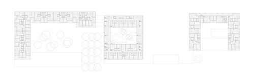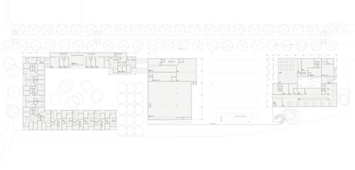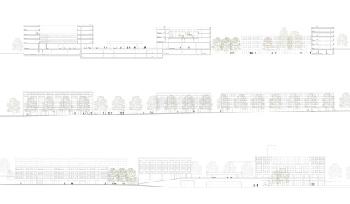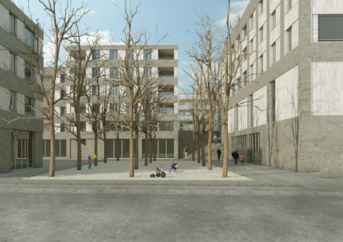 Das Zusammenstellen von verwandten Nutzungen in den drei Gebäuden sowie das Stapeln von gleichen Einheiten und das Nutzen von Synergien sind Beiträge zur kostenbewussten Realisierung und einen optimierten Betrieb. Die Konstruktion der drei Gebäude ist identisch, in ihrem Ausdruck jedoch differenziert. Die Fassaden sind aus tragenden Außenwand-Holzbauelementen erstellt. Ihre äuserste Fassadenschicht ist mit Klinkerriemchen verkleidet, während die vom Klinker gefassten, gestrichenen Holzfassadenteile die dahinter liegende Holzkonstruktion andeutet. Je nach Bedeutung und Funktion von Gebäude und Fassaden werden nun die beiden Materialien Klinker und Holz verschieden eingesetzt und variiert. Bei den Platzfassaden wird die Vertikale betont und über den Arkaden eine mehrere Geschosse umfassende Ordnung geschaffen, während die Fassaden des Wohnungsbaus horizontal gegliedert sind.