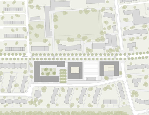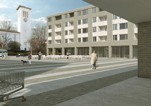 Das neue Zentrum am Friesenberg ist die Schweighof-Terrasse, ein grosser, zum Tal offener Platz. Er ist flankiert von zwei stattlichen Gebäuden, die im Dreiklang mit der bestehenden Kirche den eigentlichen Schwerpunkt des Quartiers bilden. Die Terrasse ist Treffpunkt und Identität zugleich. Sie gibt den für den Friesenberg neuen öffentlichen Blick frei hinunter auf die Binz, die Innenstadt und hinüber zum Zürichberg. Das Gegenstück zur Schweighof-Terrasse ist der intimere Baumplatz an der Arbentalstrasse. An ihm vorbei führen eine Rampe und eine direkte Treppenanlage hinauf zur Bushaltestelle und weiter zur Schule und den Sportanlagen. Angegliedert an den Baumplatz ist der Wohnhof mit Wohnateliers, Kindergarten, Hort und Gemeinschaftsraum. Das neue Zentrum wird von drei Gebäuden gebildet, die jeweils spezifische, auch städtebauliche Funktionen übernehmen und deren Fassadengestaltungen differieren.