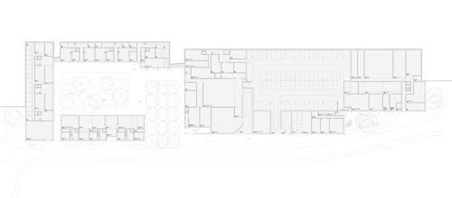 Die drei neuen Gebäude sind präzise in die bestehende Situation gesetzt. Das FGZ-Gebäude, dicht an die Kreuzung Schweighofstrasse Borrweg gestellt, übernimmt eine wichtige städtebauliche Funktion. Es bildet einen direkten Bezug zu den beiden Kirchen und der über der Strasse gelegenen Apotheke. Mit einer dreiseitig angeordneten Arkade schafft es auch die Verbindung zwischen dem Borrweg und der neunen Schweighof-Terrasse, und dabei die Möglichkeit, das Zentrum Friesenberg zu einem späteren Zeitpunkt im Norden zu erweitern. Im FGZ-Gebäude sind die Regiebetriebe wie auch die Geschäftsstelle der Genossenschaft untergebracht, welche im darüber liegenden 1. Obergeschoss erweitert werden kann. Nebenan, auf Platzniveau, besetzt das Restaurant mit Saal die Ecke zur Schweighofstrasse. Das gut besonnte Gartenrestaurant ist attraktiv und schafft zusätzliche Öffentlichkeit.