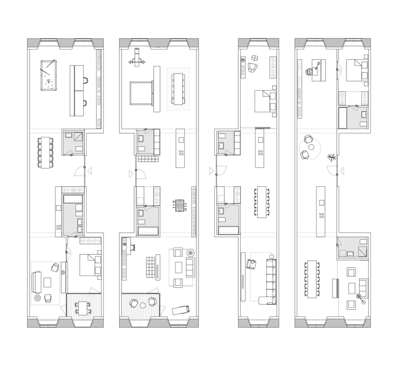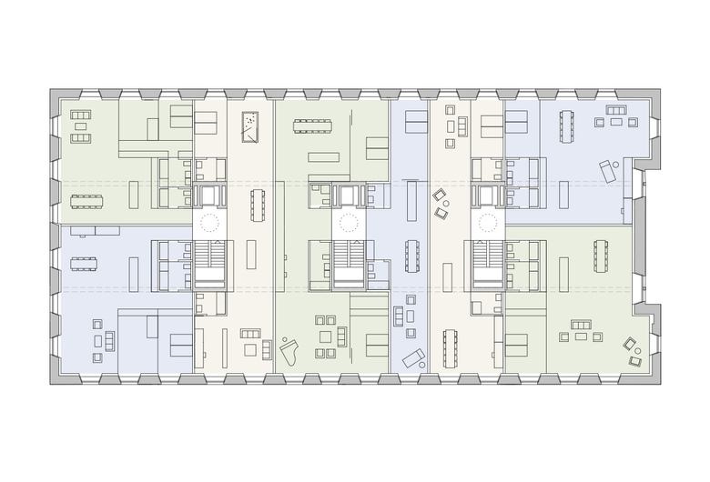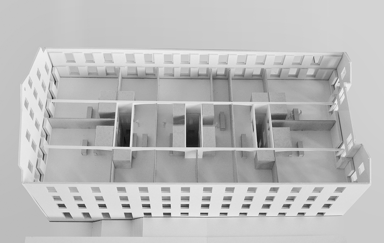 Das Konzept der drei Erschliessungskerne ermöglicht grosse Varianz der Wohnungsgrössen, Flächeneffizienz der Erschliessung, einen stützenfreien Grundriss durch Optimierung der Spannweiten und erzeugt einen seriellen Ausdruck mit „industriellem Charakter“, als Zeichen der „neuen“ Gewerbehalle.