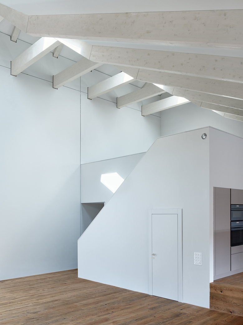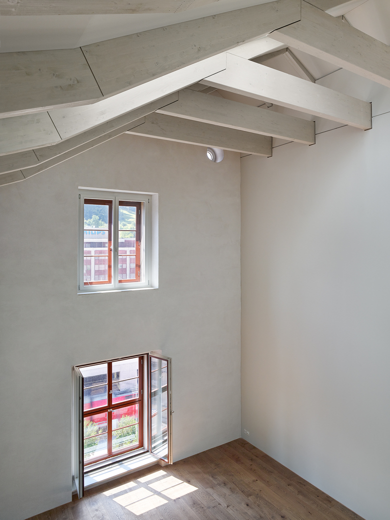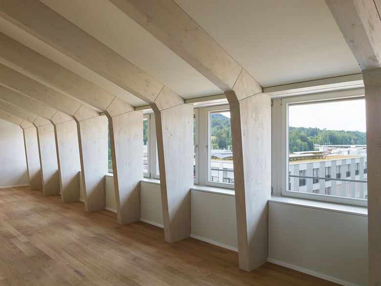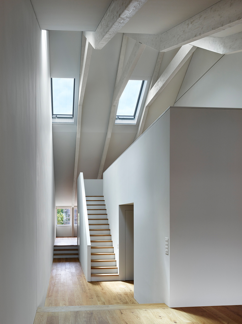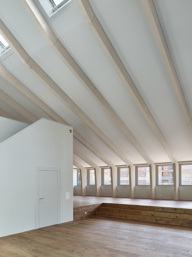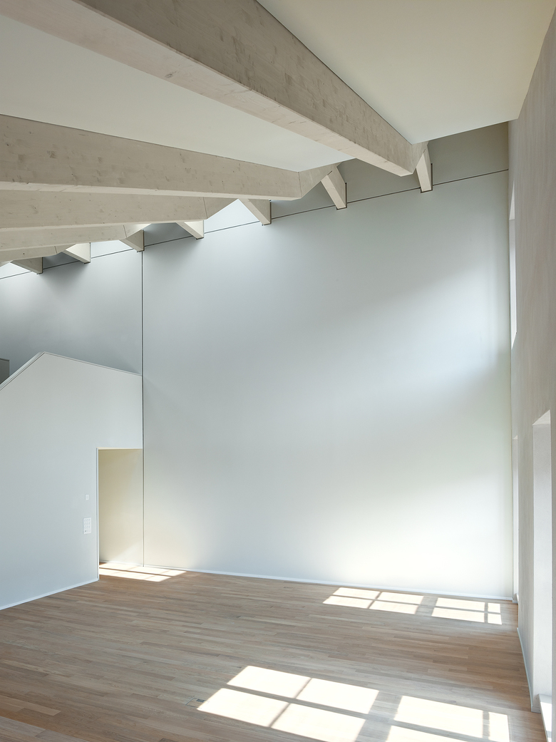 Das additive der Fassadengestaltung wird durch die durchlaufenden Fensterbänder im flach geneigten Satteldach unterstrichen. Der grosszügige Dachstuhl wird zusätzlich durch regelmässig gesetzte Dachfenster belichtet.