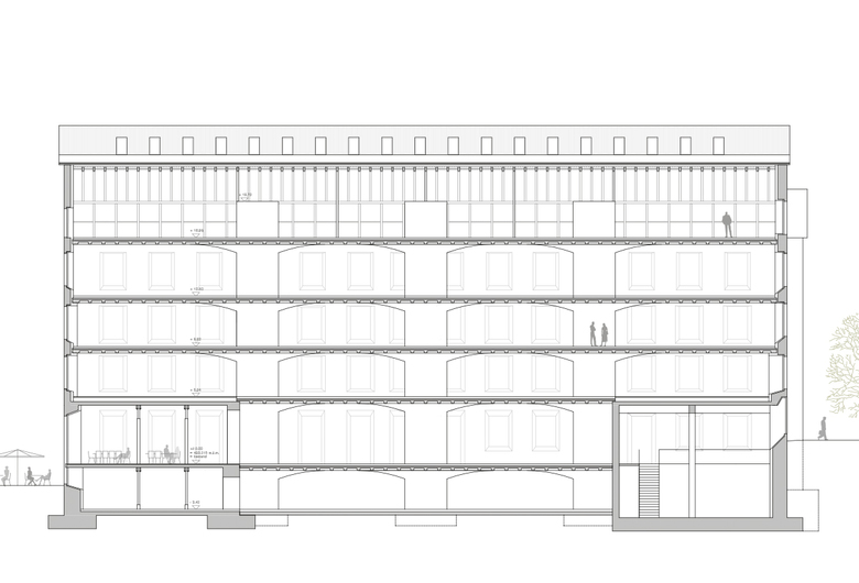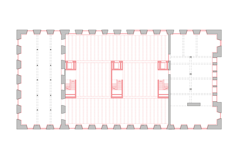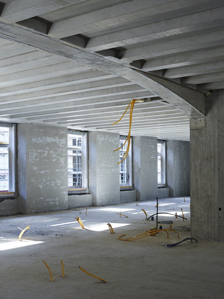 Eine effiziente neue Trag- und Erschliessungstruktur verbindet sich optimal mit dem Bestand und sichert den geforderten Erhalt der denkmalgeschützten Gebäudehülle und eine langfristig flexible Nutzung. Die neue Struktur in Verbindung mit dem Bestand transformiert das historische Bauwerk zu einem neuen kraftvollen Ganzen.
