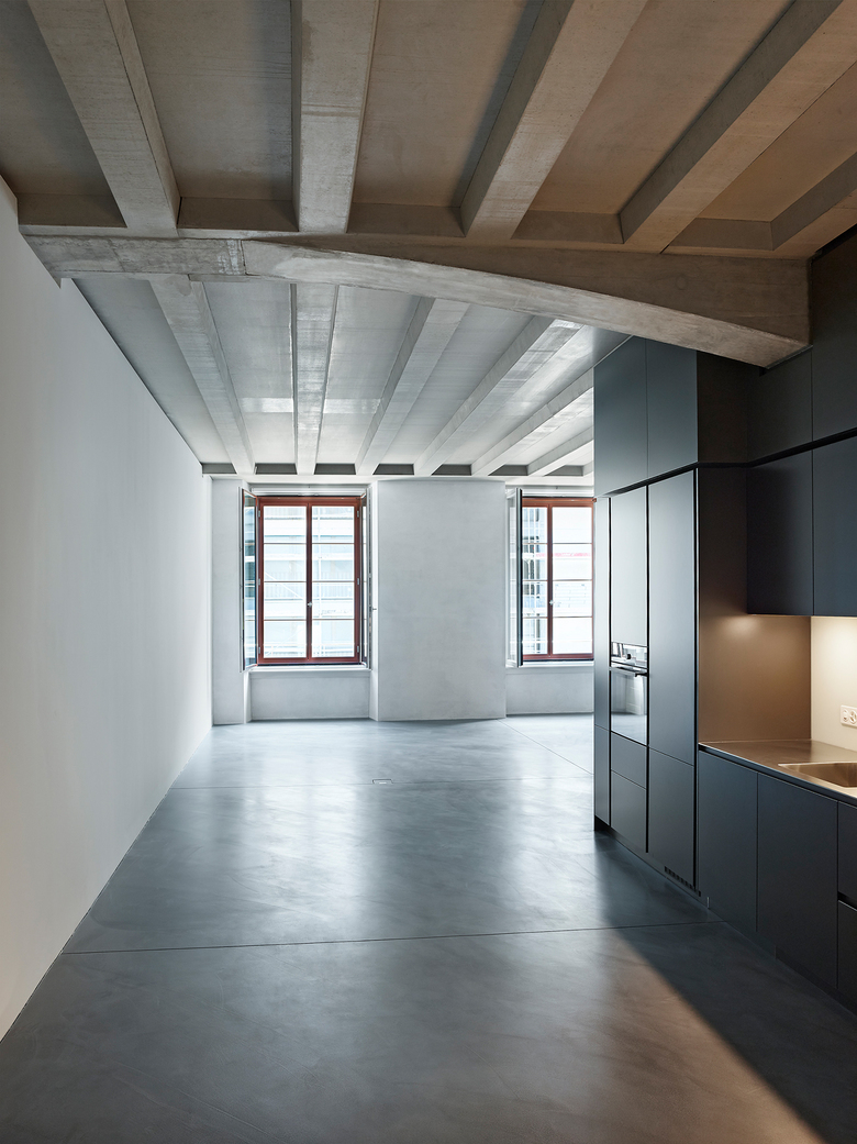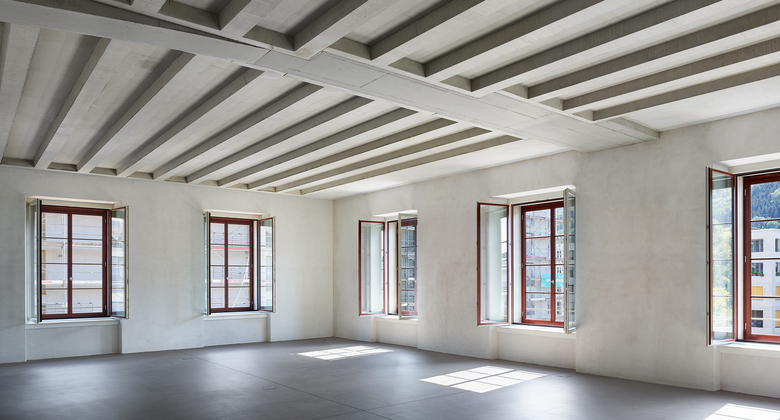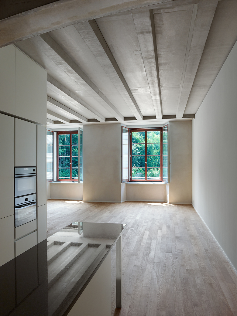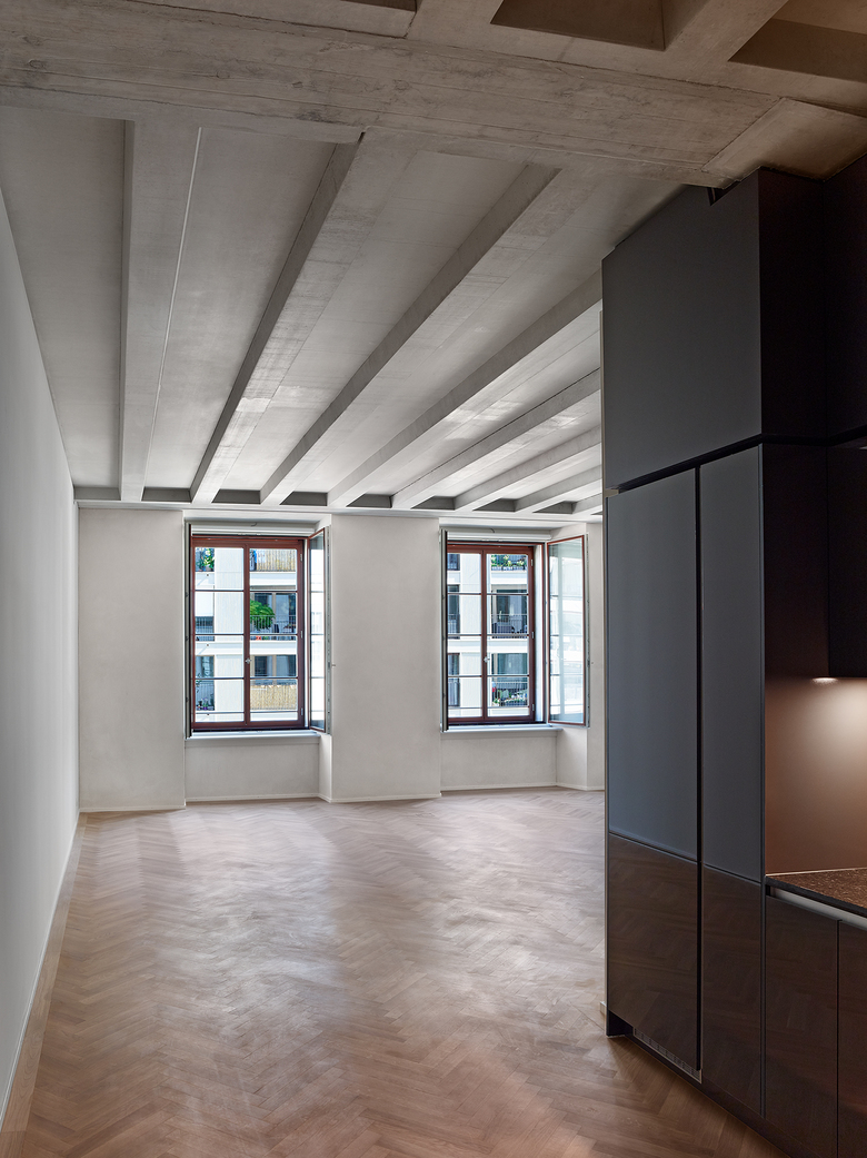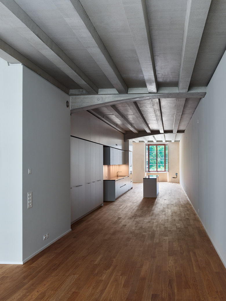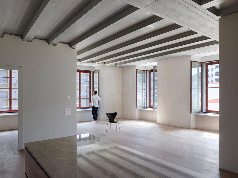 Rohe Betonkerne, Unterzüge mit Betonrippendecken, der Dachstuhl, Hartbetonböden und ungestrichener Kalkzementputz prägen in ihrer Materialität die grosszügigen Innenräume – „Wohnen in der Fabrik“.