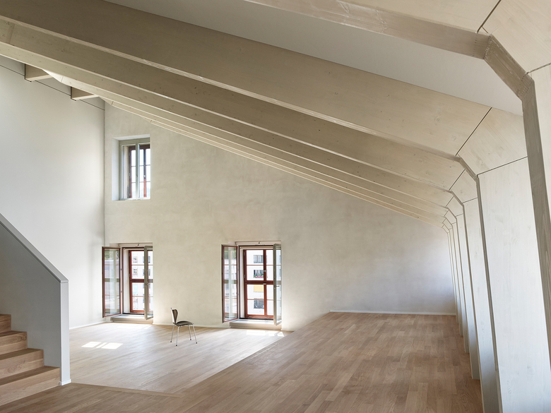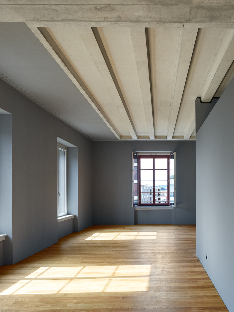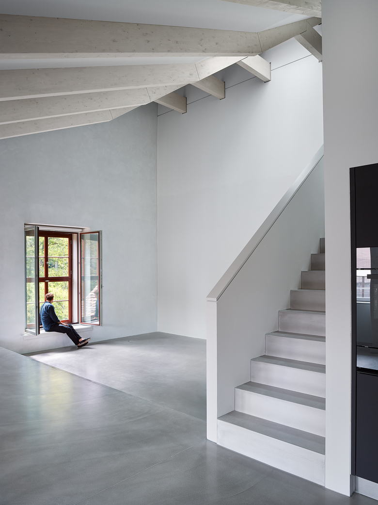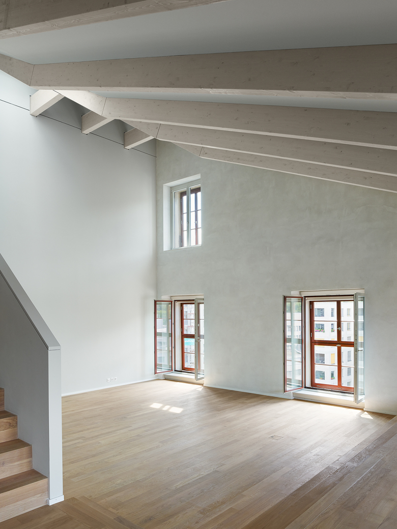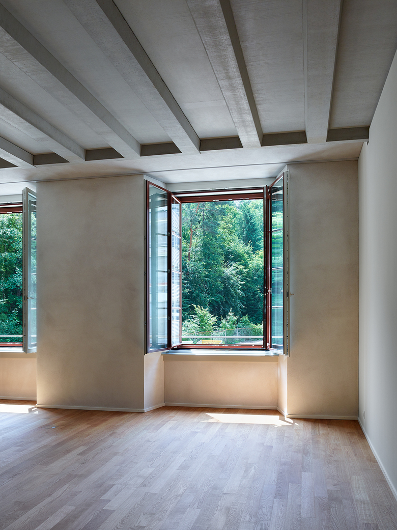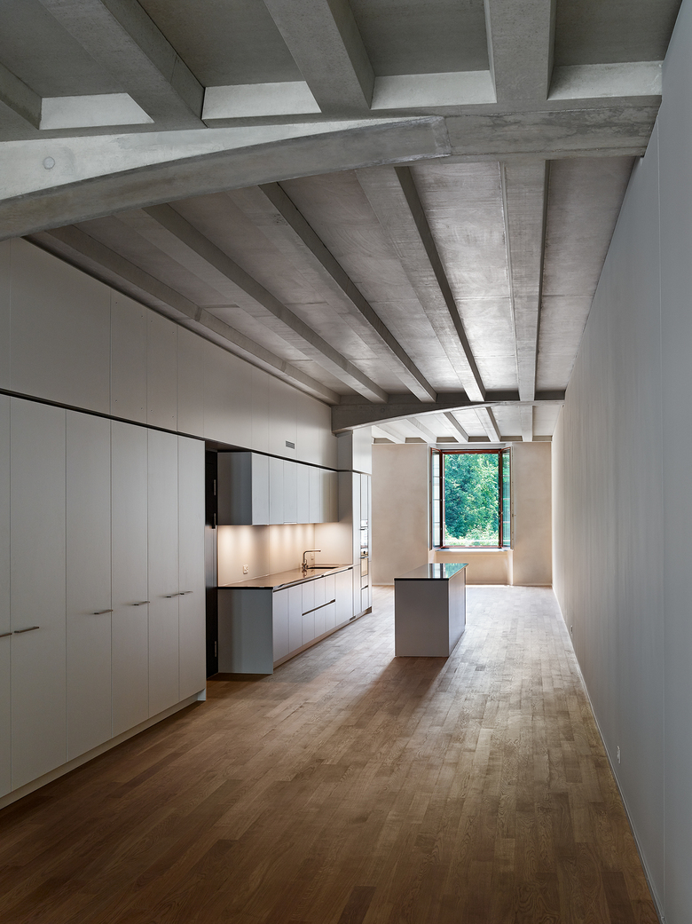 Rohe Betonkerne, Unterzüge mit Betonrippendecken, der Dachstuhl, Hartbetonböden und ungestrichener Kalkzementputz prägen in ihrer Materialität die grosszügigen Innenräume – „Wohnen in der Fabrik“.