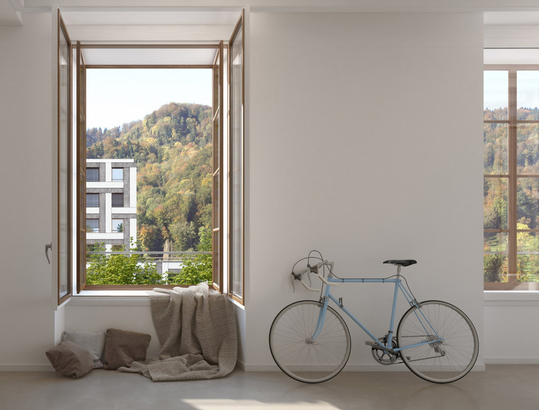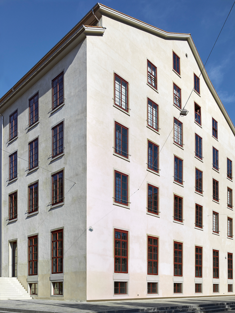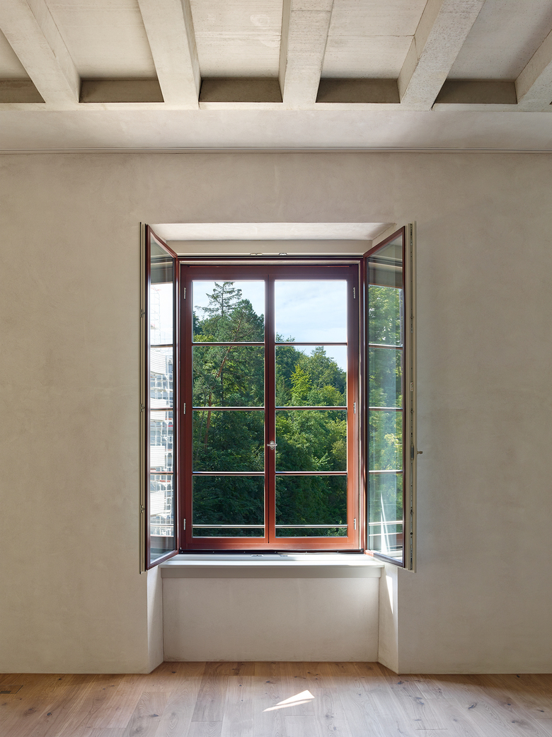 Die Fassadengestaltung des bestehenden Spinnereigebäudes ist klassizistisch funktional. Die auffallendste Charakteristik ist die beeindruckende Addition gleichartiger, grosser Fenster. Diese werden als Doppelfenster ausgebildet: Zwischen den Vorfenstern mit der historischen Fensterteilung und den isolierten Innenfenstern kann diskret der Sonnenschutz integriert werden. Im Bereich der neuen öffentlichen Nutzungen im Erdgeschoss werden die vorhandenen Öffnungen bei gleichbleibender Breite nach unten verlängert und verstärken den Bezug zum Aussenraum.