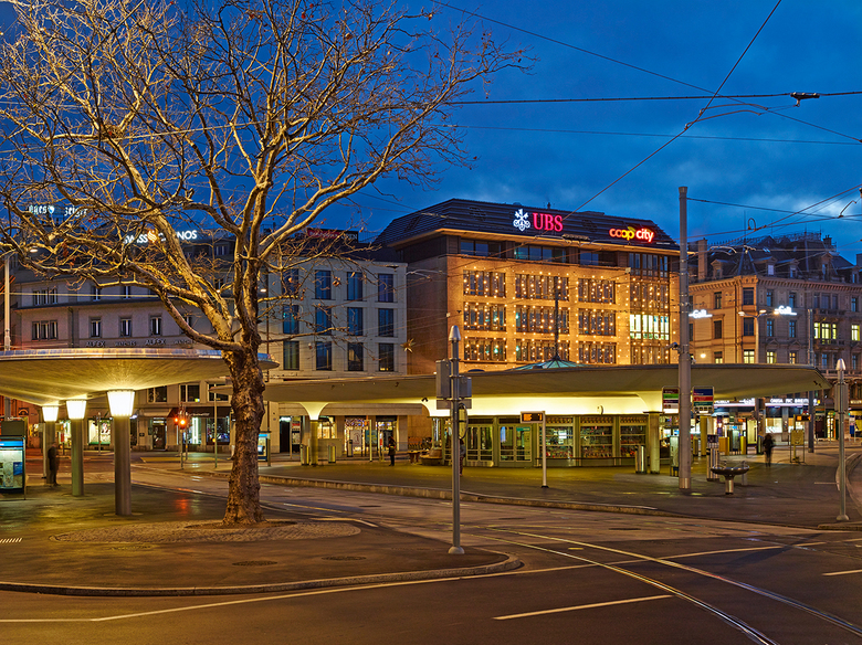 Das Konzept der Flachgründung der neuen Wartehallen mittels einzelner Stahlplatten unter den drei Stahlstützen reagiert auf die hochkomplexe Situation mit einer Vielzahl von bestehenden Leitungen und Infrastruktureinrichtungen im Erdboden.