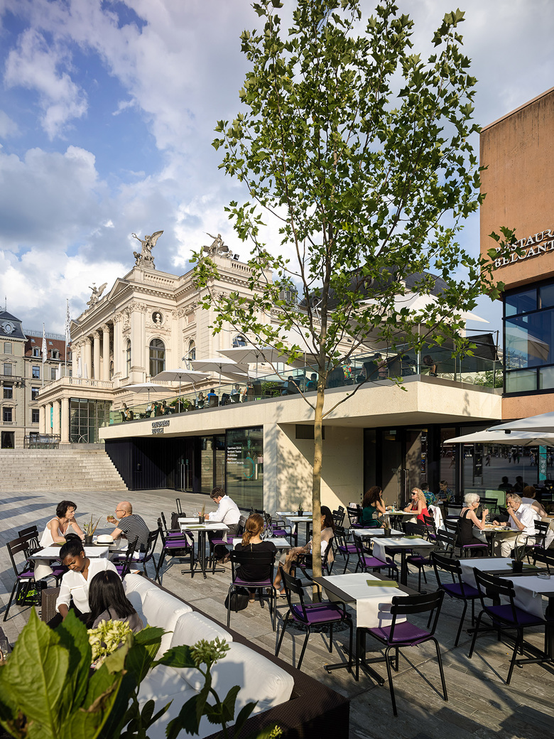 Durch das neue angrenzende Bistro mit Aussenbestuhlung erhält das Restaurant Belcanto den gross-zügigen Anschluss an den Sechseläutenplatz. Die um drei Stufen angehobene Hauptebene des Bistros verweist auf die komplexe Umbausituation: unter dem scheinbaren Podest befindet sich direkt die bestehende Lüftung des Ballettsaals.