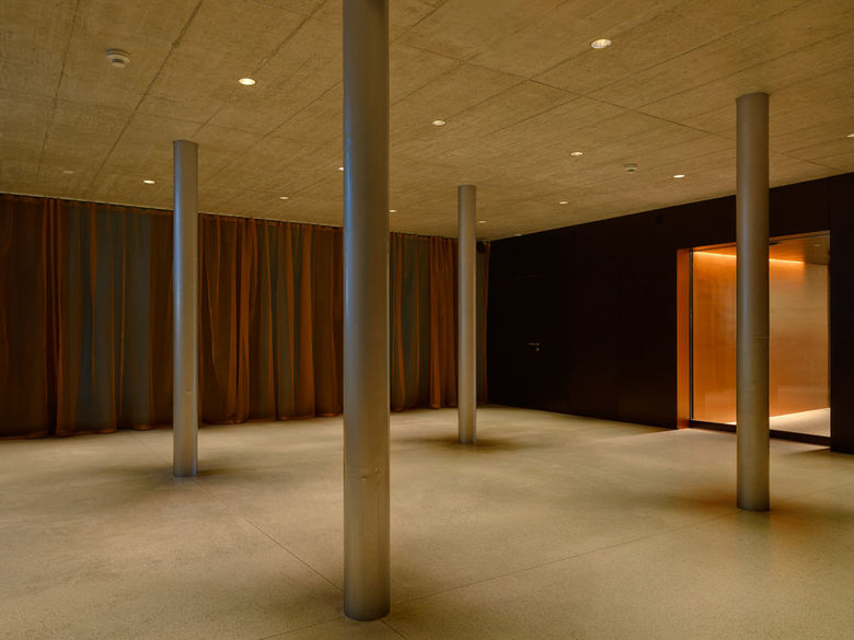 Das Farb- und Materialkonzept sucht die Verbindung der sehr unterschiedlichen Räume im Unter- und Erdgeschoss. Der metallische Kupferfarbton, das Aubergine differenziert in glatter Ausführung und Ausführung mit grober Kammstruktur und glänzendes Schwarz prägen auf einfache und kostenbewusste Weise die frische Festlichkeit, unterstützt durch die mundgeblasenen grossformatigen Leuchten.