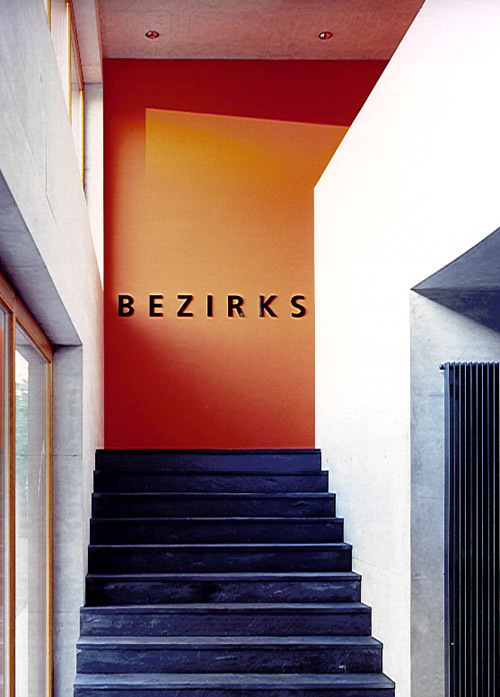 Über den grosszügigen Fussgängerbereich unter den alten Platanen entlang der Poststrasse werden der Posten der Kantonspolizei im Erdgeschoss und das Bezirksamt im 1. Obergeschoss erschlossen. Weitere Büroräume im Obergeschoss, sechs Gefängniszellen, angeschlossen an den Polizeiposten, 6 Wohnungen im Dachgeschoss und eine Tiefgarage erweitern die sehr komplexe Nutzungsmischung.