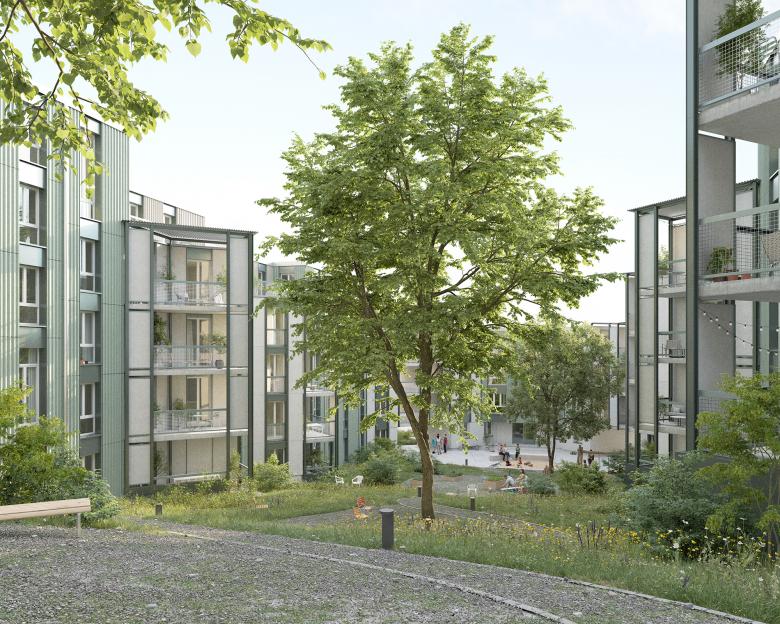Das Grundstück liegt am Nordhang des Üetlibergs, direkt unterhalb des Friedhofs Eichbühl. Neben ca. 220 Wohnungen unterschiedlicher Grösse sind verschiedene gemeinschaftliche Nutzungen und ein Doppelkindergarten geplant.