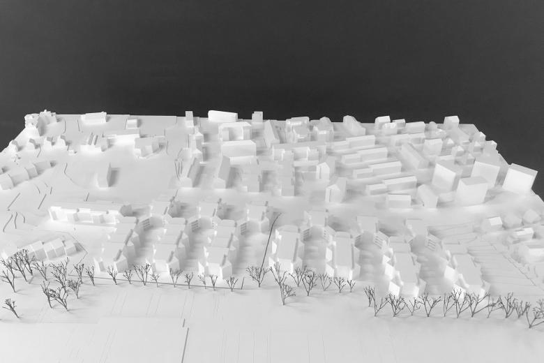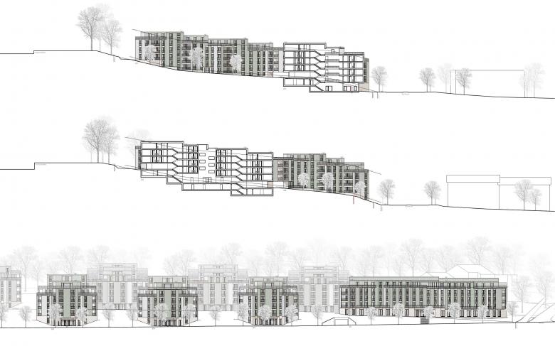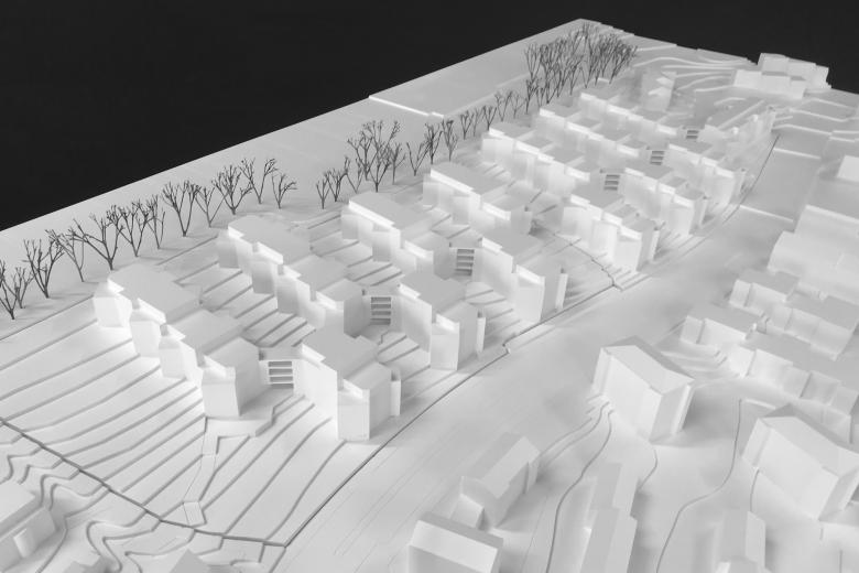 Einfache zeilenartige Baukörper, welche senkrecht zu den Höhenlinien angeordnet sind, werden über den Zusammenbau von diagonal ausgestellten Balkonen zu einer kräftigen ortsbaulichen Figur verbunden.