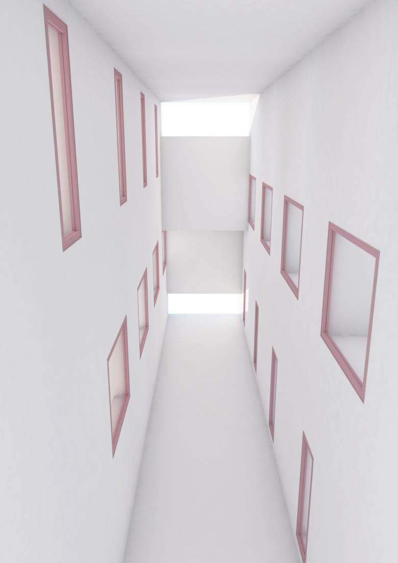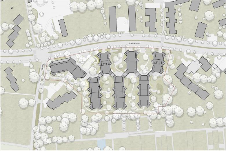 Erschlossen werden die Bauten über Eingänge entlang der Rautistrasse. Daran anschliessend folgt eine räumlich attraktive rue intérieure, welche behindertengerecht hangaufwärts führt. Eine Wohngasse welche den Höhenlinien folgend das ganze Grundstück durchmisst, verbindet die über die Balkontürme gekoppelten Zeilen. Entlang des Weges werden gemeinschaftliche Nutzungen angeordnet, ebenso soll ein breites Nutzungsangebot im Freiraum dafür sorgen, dass die Wohngasse zum sozialen Treffpunkt und Identifikationsort der neuen Siedlung wird.