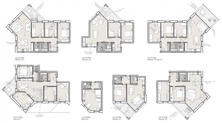 Die Struktur der Wohnungsgrundrisse ist einfach und kostengünstig, der sehr vielfältige Wohnungsmix ist Basis für ein breites Spektrum an unterschiedlichen Lebens- und Familienformen welche in der neuen Siedlung ihr Zuhause finden sollen.