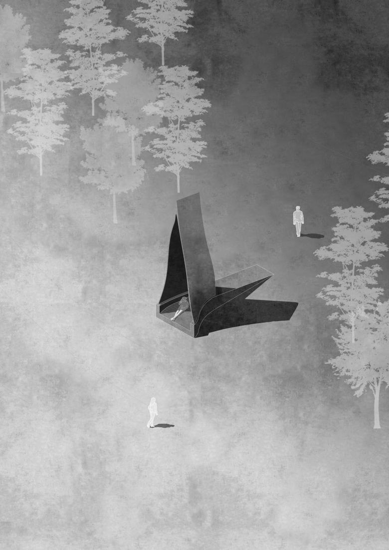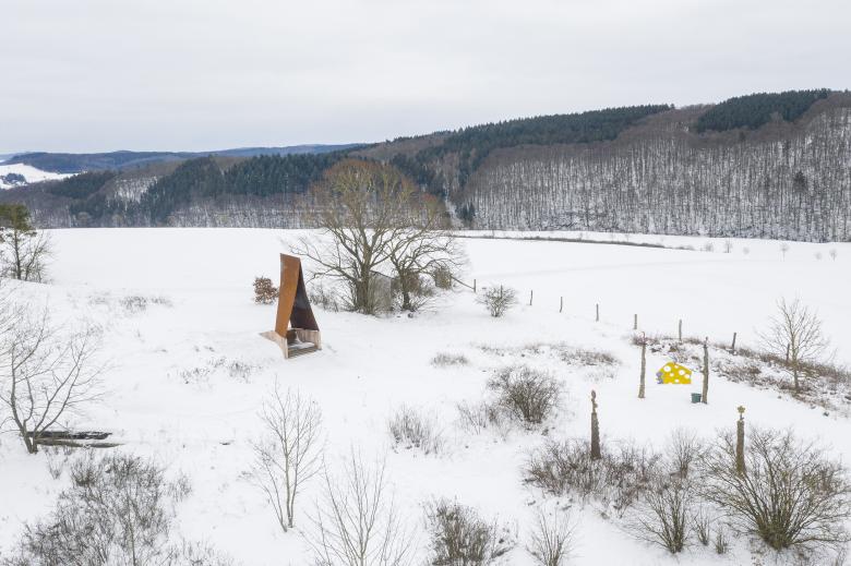 Auf dem Osterfeuerhügel oberhalb von Referinghausen thront der Sonnenklang Open Mind Place. Das zeltförmige Dach über einer Holzliege fängt die Lichtstrahlen der Abendsonne und die Klänge der Umgebung ein. Hier kann sich der Besucher ausruhen und die Landschaft in sich aufnehmen.