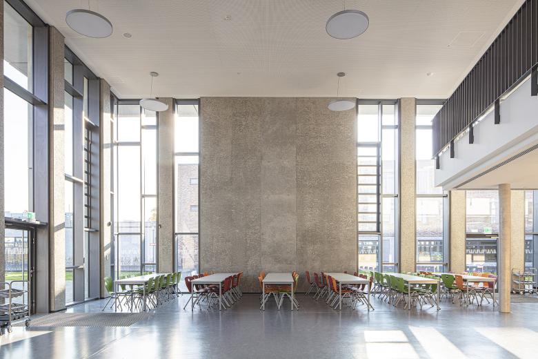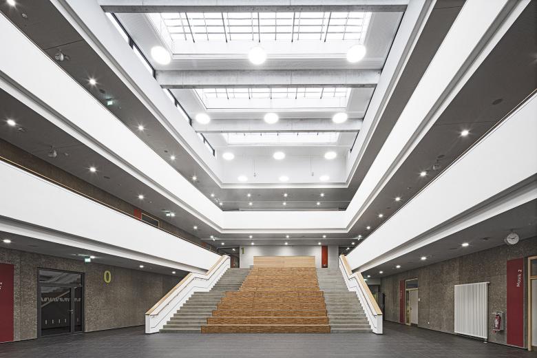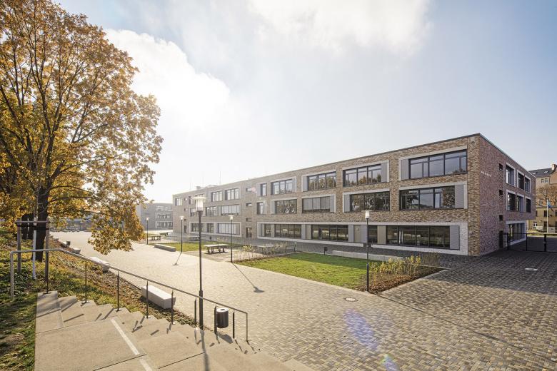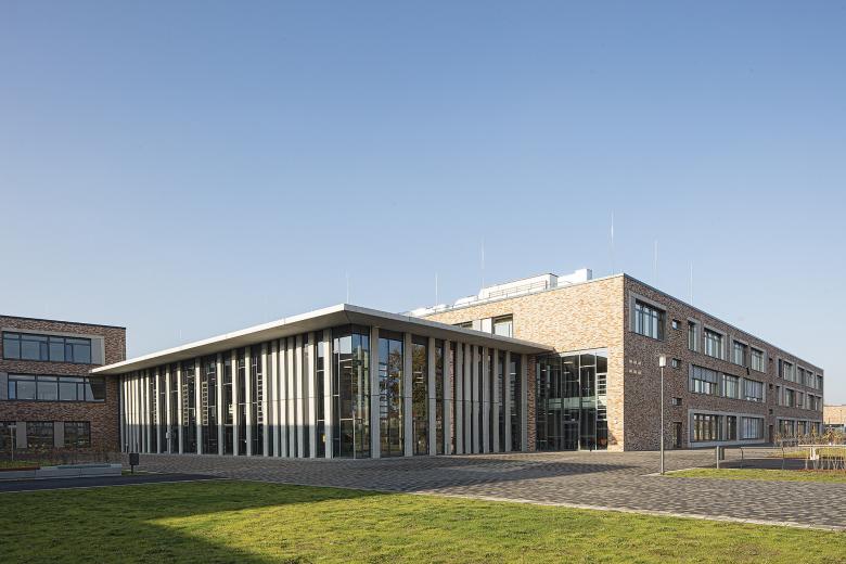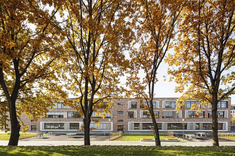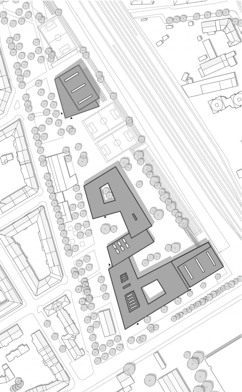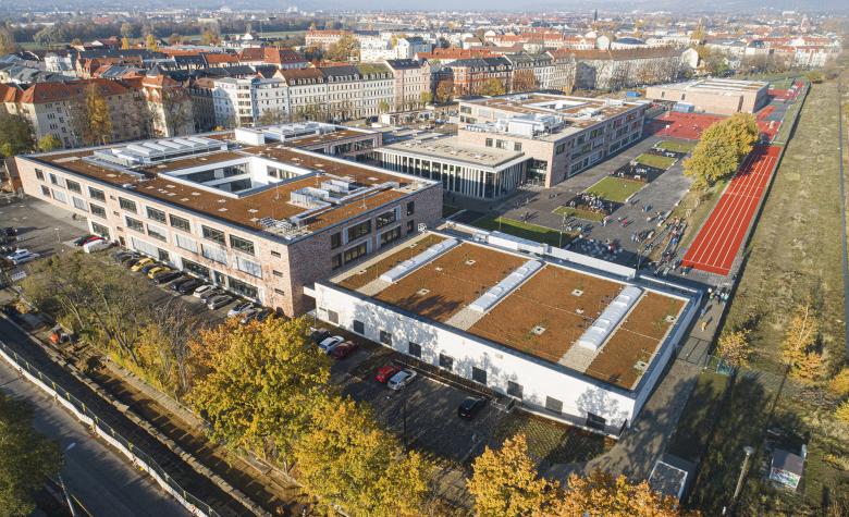 Das Areal des ehemaligen Güterbahnhofs in Dresden-Pieschen war ein unwirtlicher Ort – ohne Bedeutung oder Bezug zur Stadt. Durch die geschickte Anordnung des fünfzügigen Gymnasiums und der ebenso großen Oberschule samt zwei Sporthallen konnte das spitz zulaufende Grundstück für den gesamten Stadtteil reaktiviert werden. Aufbauend auf dem Masterplan „Leipziger Vorstadt“ orientiert sich die Bebauung einerseits an dem östlich gelegenen Gründerzeitquartier und anderseits an den fächerförmigen Spuren des ehemaligen Industriegebiets. Verbindendes Element alter und neuer Strukturen ist ein 30m breiter Grünzug, der dem Austausch und zur Erholung dient. Die Schulen sowie die Sporthalle des Gymnasiums werden zu einem Gebäudekomplex zusammengefasst, wobei die einzelnen Funktionen ablesbar bleiben und sich durch Vor- und Rücksprünge mit dem Freiraum verzahnen. Mensa und Aula, die wie die Sporthallen auch extern genutzt werden, bilden dabei den torartigen Mittelpunkt der kommunikationsfördernden Lernlandschaft.