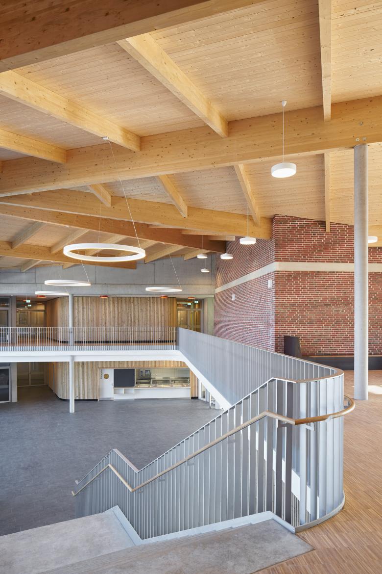 Die Eider-Nordsee-Schule Wesselburen entstand als Erweiterungsneubau unter Einbeziehung des heterogenen Gebäudebestandes am Standort der Friedrich-Hebbel-Schule. Durch die zentrale Positionierung des Neubaus und des Vorplatzes ergibt sich eine klare räumliche Neuordnung des Schulareals, dessen Mitte von der zweigeschossigen Aula mit Mensa gebildet wird. Diese verbindet den Erweiterungsneubau direkt mit dem zu sanierenden denkmalgeschützten Gebäude von 1951. Die zurückhaltende Materialsprache der Fassade aus Holz und Stein prägt gemeinsam mit dem gefalteten Dach, dessen Hochpunkte sich an den innenräumlichen Freilernzonen orientieren, das äußere Erscheinungsbild des Neubaus.