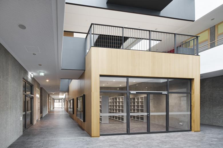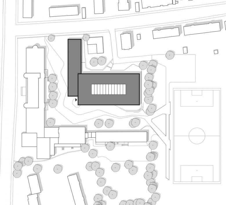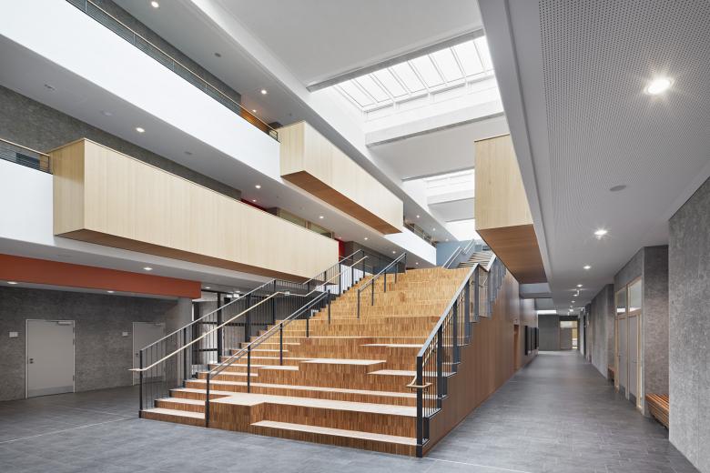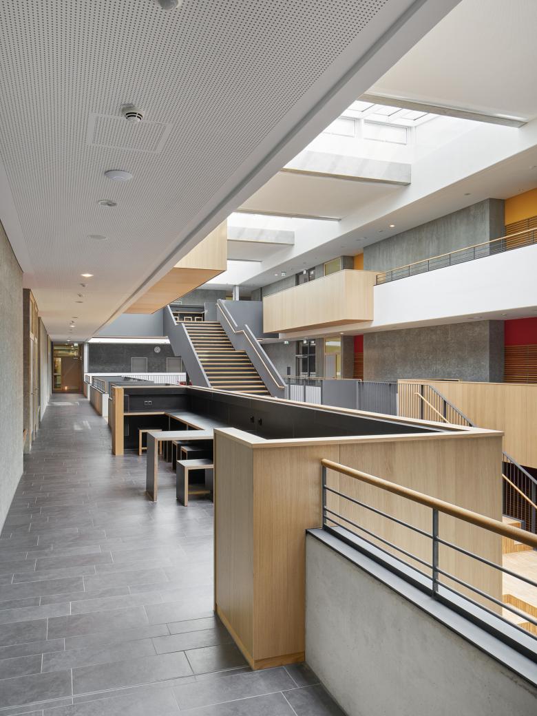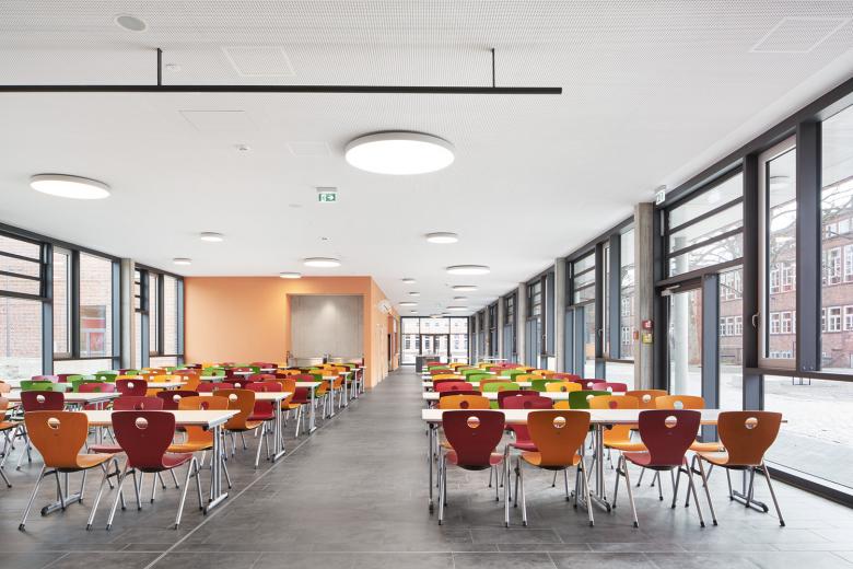 Nach Norden fügt sich eine eingeschossige Mensa als Öffnung zum Stadtteil an, die auch für außerschulische Veranstaltungen separat genutzt werden kann.