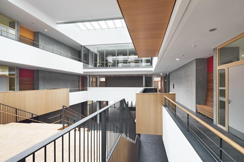 Leitidee unseres Entwurfs war es, den denkmalgeschützten Altbau mit dem Erweiterungsbau im Sinne eines Schulcampus zu einem Gesamtensemble zusammenzufügen. In Verlängerung der Mittelachse des Altbaus positionieren wir einen dreigeschossigen, sehr kompakten Baukörper um eine zentrale Halle mit freier Lernlandschaft .