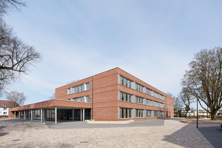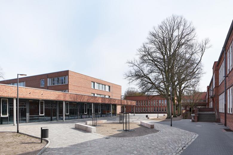 Durch die Verwendung fast identischer Ziegel, hellen, bandartigen Fensterbändern und Reliefbändern entsteht gleichzeitig eine große Verwandtschaft zwischen Alt-und Neubau sowie eine deutlich erkennbare Zeitgenossenschaft der neuen Schule.