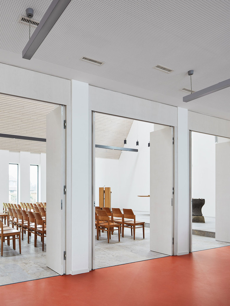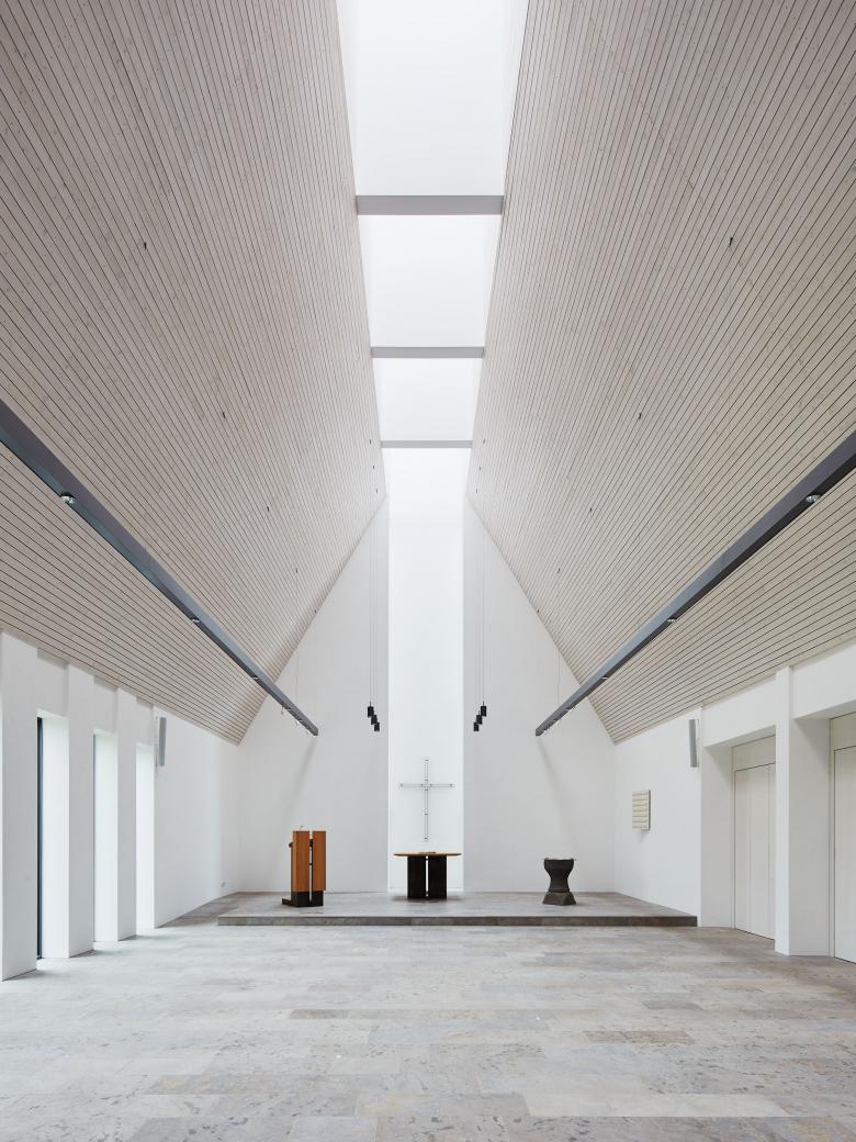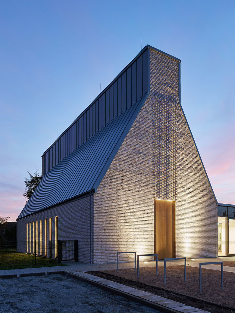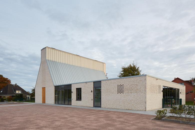 Das neue Kirchenzentrum in Kl. Offenseth-Sparrieshoop soll sich stärker und prägender als bisher im Dorfbild darstellen und eine räumliche Mitte generieren. Dafür werden vertraute, archetypische Bilder und Motive, Formen und Materialien verwendet, die jedoch durch eine Überhöhung ins Markante das Kirchenzentrum auf dem profanen Kontext des Umfeldes hervorheben. Als Gebäudeensemble bildet das Kirchenzentrum räumlich einen „Kirchplatz“ als Eingangsbereich. Formal, materiell und ästhetisch bilden Kirche, Gemeindehaus und KiTa ein Gebäudeensemble, das sich aus dem typologischen Grundmuster des Klosters ableitet und eine Haltung der Bescheidenheit postuliert. Der einschiffige Kirchenraum bietet 150 Plätze und lässt sich zum Gemeindesaal hin durch große Flügeltüren erweitern. Die Räume des Gemeindehauses und der Kita gruppieren sich um den Innenhof.