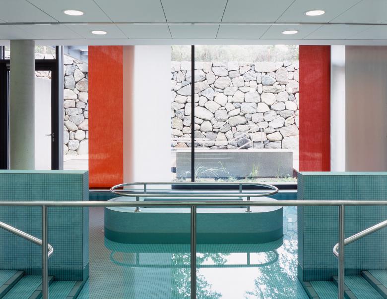 Das Schulungszentrum beinhaltet Seminarräume, Freizeiteinrichtungen, einen Mehrzwecksaal, die Verwaltung sowie die Speiseversorgung mit Küche. Zentrum ist der große Speisesaal, der wie eine gläserne Vitrine zwischen der öffentlichen Piazza und dem sonnigen Südgarten liegt, und daher fast als Teil des Außenraumes erlebt wird. Um dem gemeinsamen Essen der 300 Patienten eine ruhige, angenehme Atmosphäre zu geben, ist der Raum in Sitznischen, Bankreihen und Einzeltischen differenziert gegliedert. Alle Plätze ermöglichen den Blick in die Natur.