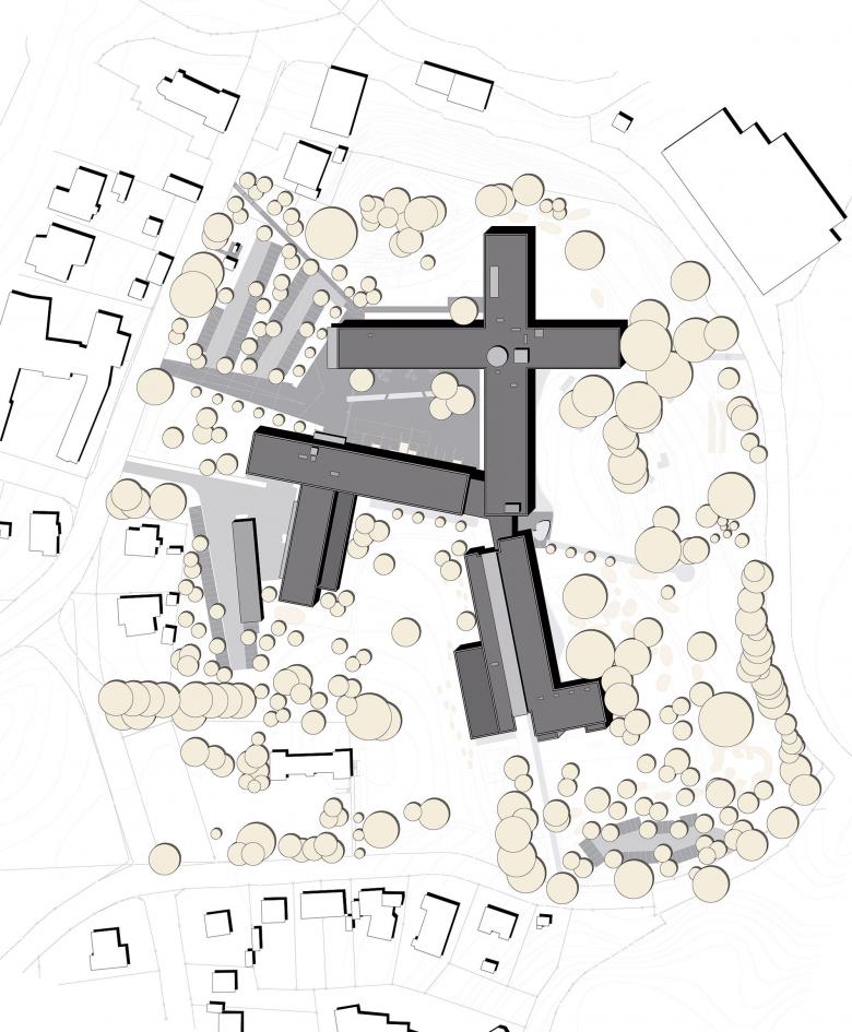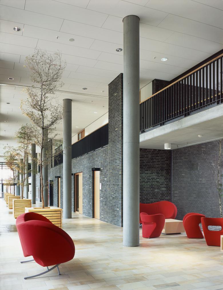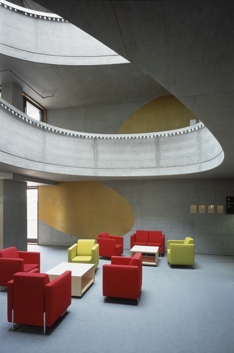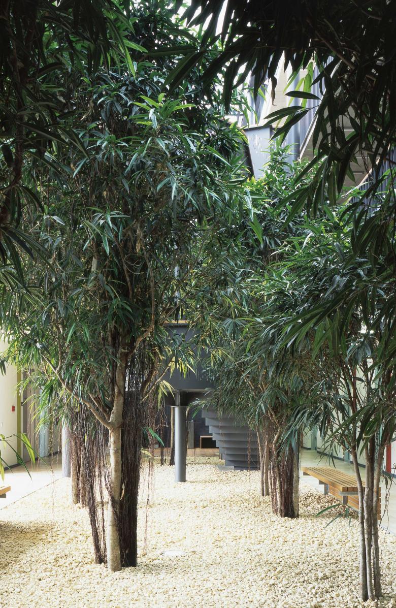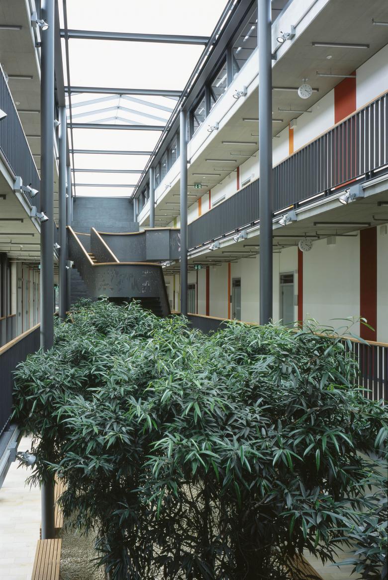 Das Therapiehaus ist als vertikal organisierte Therapielandschaft konzipiert. Mittelpunkt und Rückgrad bildet eine dreigeschossige Halle, die mit einem Birkenfeigenhain eine ganz besondere Atmosphäre hat. Sie bietet gleichzeitig Raum für Erschließung, Orientierung, Aufenthalt und Begegnung.
