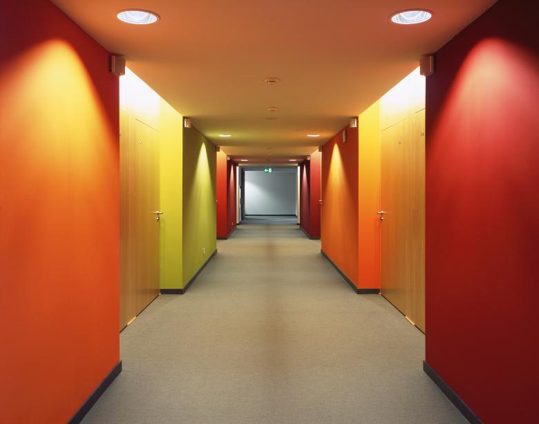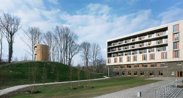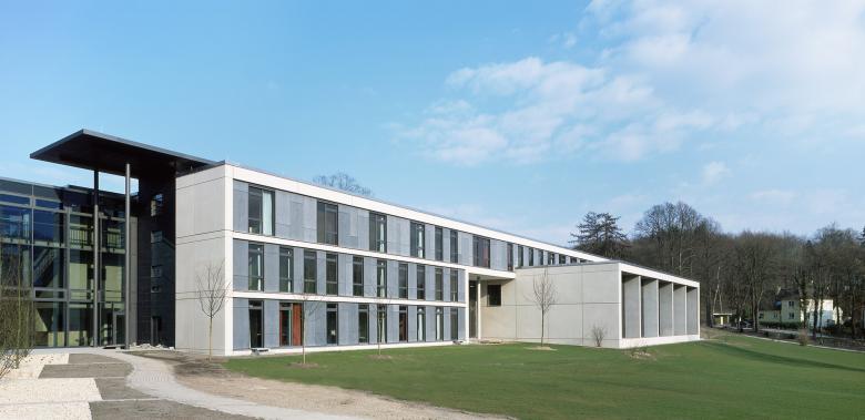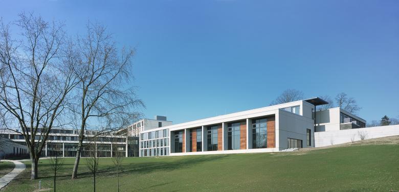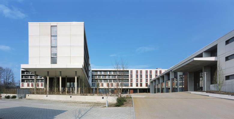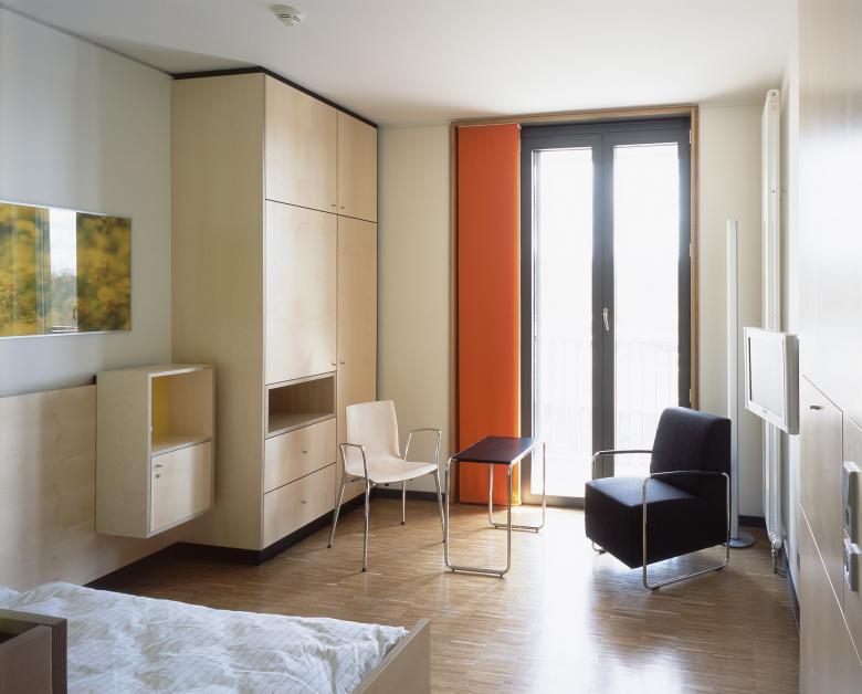 Gästehaus – In den vier Hauptgeschossen des Gästehauses sind die kreuzförmig um einen Stützpunkt angelegten Stationen untergebracht. Die als Orangerie gestaltete Wandelhalle im zweigeschossigen, transparenten Sockel dient der Erschließung des gesamten Hauses. Verschiedene Eingänge, Sitzbereiche, der Übergang zur angegliederten Facharztpraxis und die Cafeteria machen sie zum Ort der zwanglosen Begegnung.