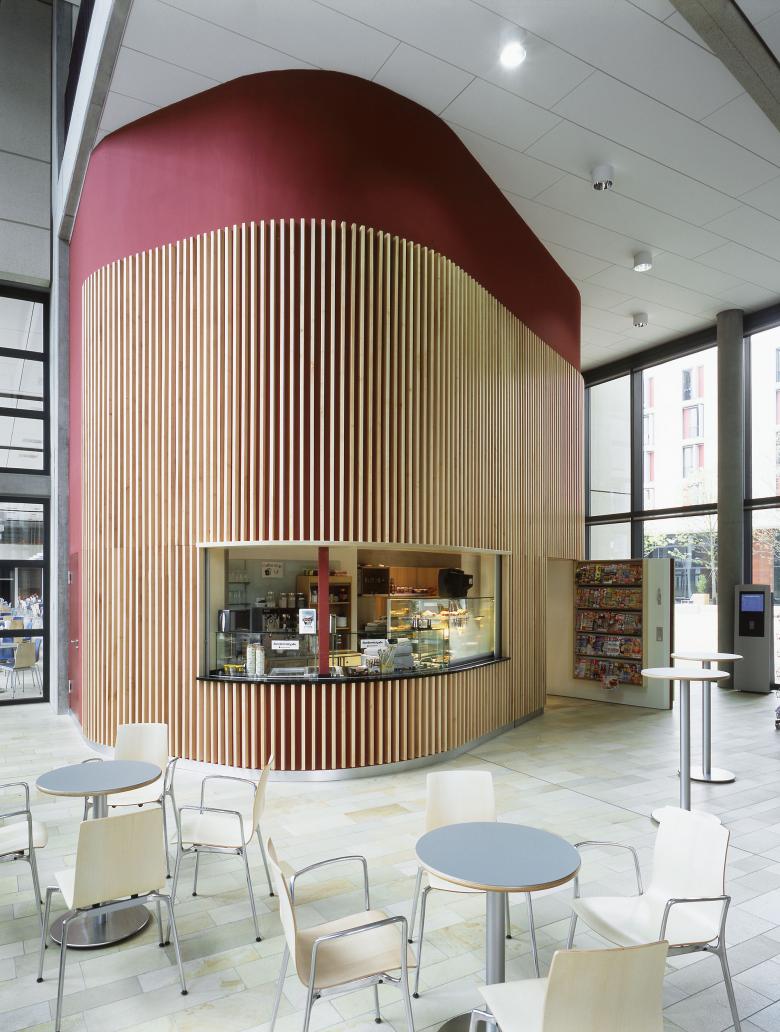 Weitere öffentliche Funktionen wie Bibliothek, Frisör und Läden in eingestellten steinernen Boxen unterstützen das Konzept der Offenheit und Kommunikation. Die Flure der Stationen gliedern sich vielgestaltig durch Aufweitungen und lichte Aufenthaltszonen sowie durch ein lebhaftes Farbspiel. Alle Zimmer haben Ausblick zum Dieksee oder in die Parklandschaft.