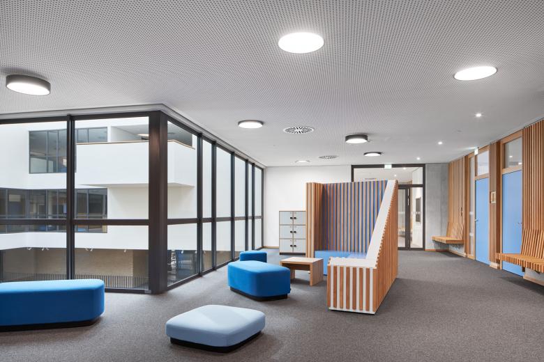 Der Neubau des Berufsbildungszentrums Dithmarschen in Heide ist für vier pädagogische Zentren mit gemeinsamen Fachunterrichtsräumen und einem Verwaltungsbereich konzipiert worden. Ein offenes Atrium bildet über vier Geschosse die gemeinsame Mitte. Eine Bühne im Erdgeschoss und eine große Freitreppe zum 1. Obergeschoss bilden den Rahmen für Veranstaltungen. Das kompakte Haus mit seiner Ziegelfassade öffnet sich über das halbe Erdgeschoss mit einer verglasten Foyerfassade zum Außenraum. Im Inneren sorgen offene Nutzungseinheiten für einen vielseitigen Raum zum Lernen, Flurbereiche wurden bewusst vermieden.