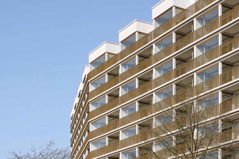 Die Architektur beschränkt sich auf das funktional und konstruktiv Notwendige. Durch ausgewogene Proportionen, Wiederholung, Präzision und charaktervolle Materialien wird eine hochwertige Gestaltung geschaffen. Das Wohnhochhaus hat eine Verwandlung erfahren: Von einer anonymen Gestalt zu einer klaren und zeitgemäßen Formensprache voller Leichtigkeit.