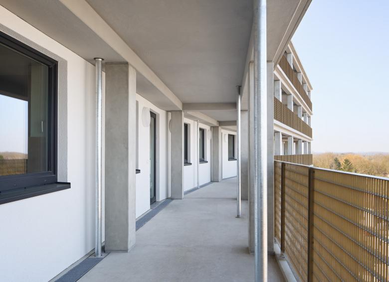Vorgesetzte Betonfertigteile schaffen nicht nur einen einheitlichen, filigranen Rahmen für die neue Laubengangerschließung auf der Nordseite, sondern ebenso für Loggien und Wintergärten auf der Südseite. Dank dieser Erweiterung konnte der Bestand kompakter gestaltet, energetische Probleme beseitigt sowie die Grundrisse neu strukturiert und teilweise barrierefrei ausgebaut werden.