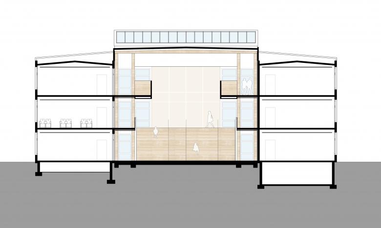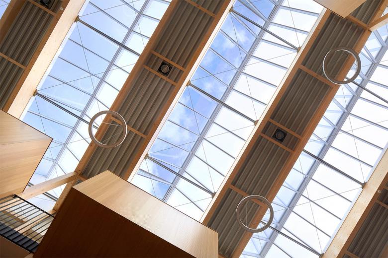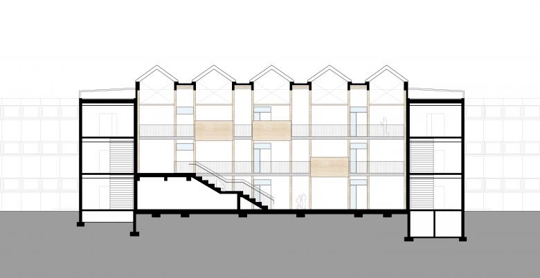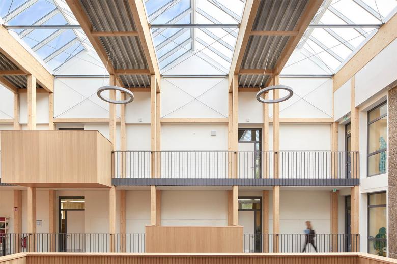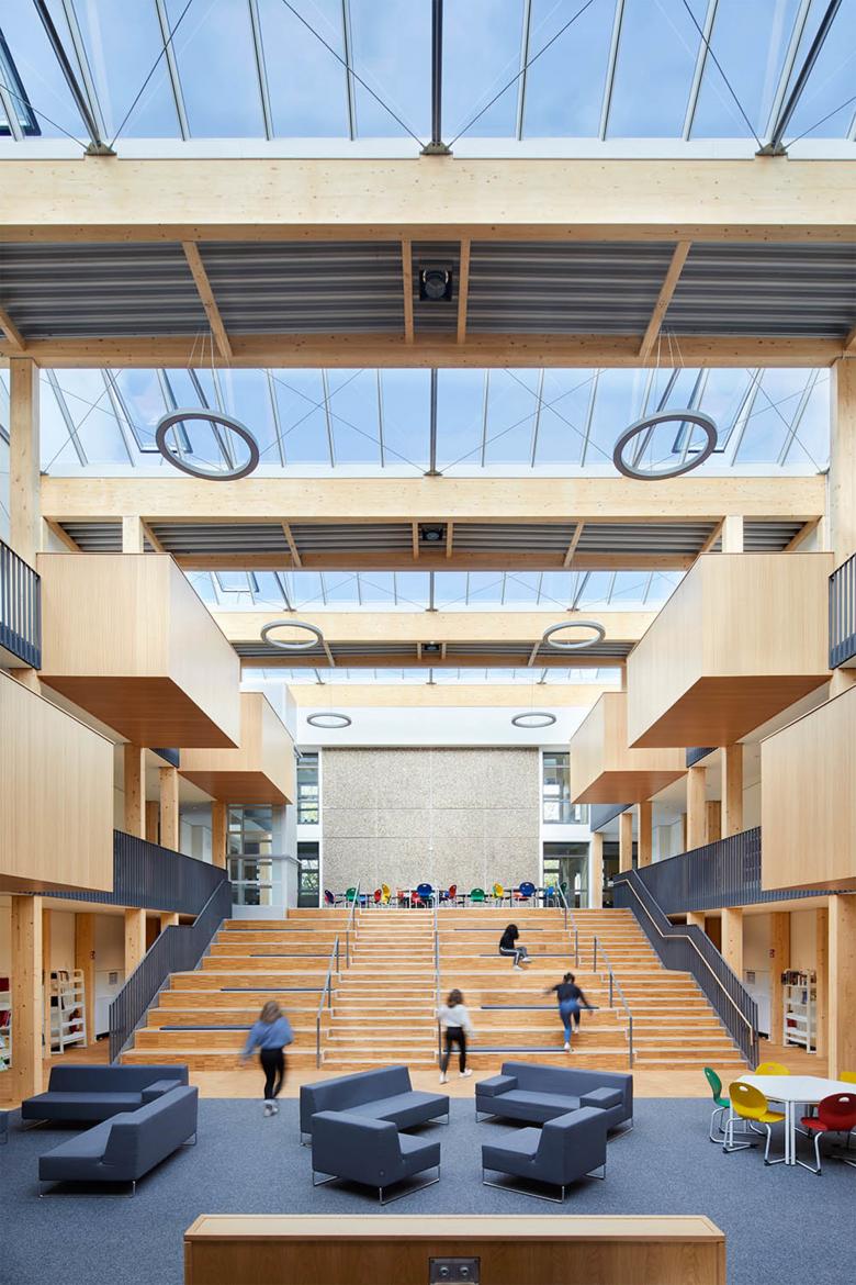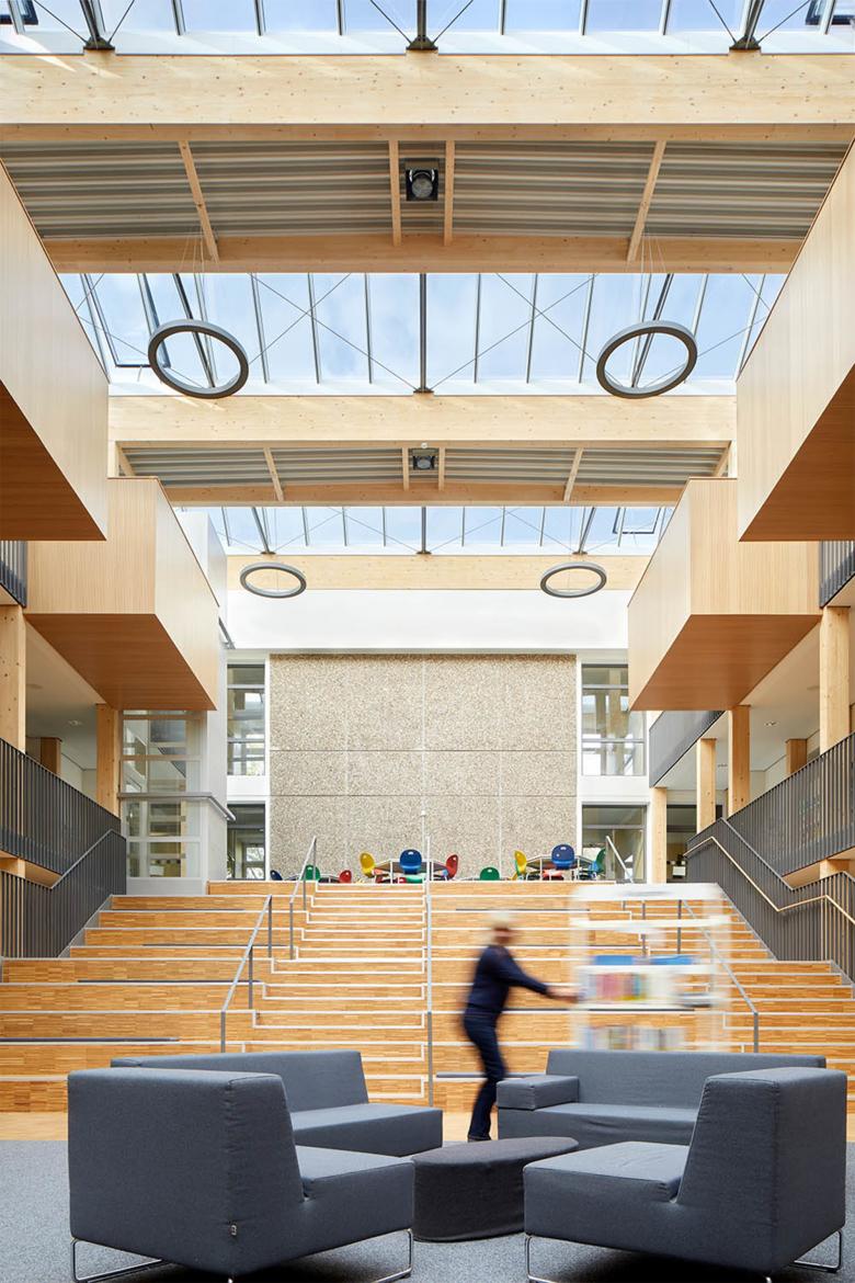 Die Erweiterung der Stadtteilschule Stellingen macht klar: Manchmal braucht es nicht viel, um ungeahnte Möglichkeiten entstehen zu lassen. Ein neues Dach, das zwischen den alten Waschbetonmauer des h-förmigen Bestandgebäudes aufgespannt wird, getragen von einer hölzernen Konstruktion, die die einst voneinander getrennten Gebäudeteile verbindet und eine großzügige Treppenanlage, die neue Beziehungen schafft – zwischen den Geschossen und der Schülerschaft. Der neue Gemeinschaftsraum beheimatet die Mediathek, bietet durch Lernbalkone Rückzugsmöglichkeiten und fördert durch Sitzstufen den klassenübergreifenden Unterricht. Fast beiläufig wird das Gebäude energetisch, funktional und gestalterisch aufgewertet. Wie gut, dass sowohl das Konzept – ursprünglich sollte die Mediathek zusammen mit weiteren Klassenräumen in einem Neubau untergebracht werden – als auch das Gebäude neu überdacht wurden.