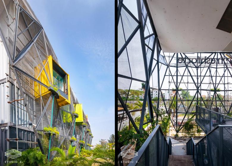 A geometric steel mesh façade covered with plants veils the complex container arrangement and reveals surprising spatial configurations and transitional spaces between outside and inside, to be explored by the visitor.