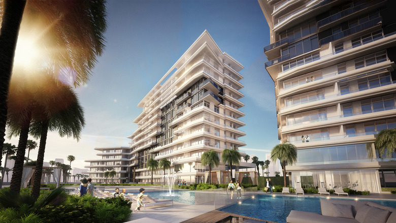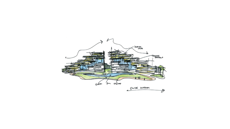 Explaining how the design embraces the notion of wellness, Ted Givens, Design Partner at 10 DESIGN said: “The development creates a bold terraced landscape offering expansive views out over the Dubai Creek. Set within a bucolic oasis, a large pool defines the center of the lush garden, with a jogging loop weaving its way through the landscape. The garden textures are pulled up over the buildings. The terracing is amplified by a series of duplexes that sweep though the center of the twin towers forming a glass arc across the facades, symbolizing water flowing through the landscape.”